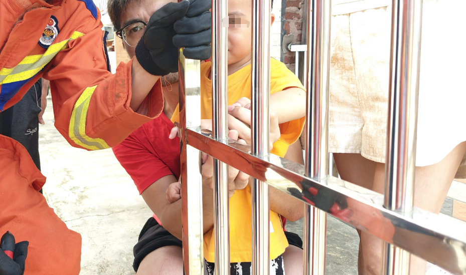 現(xiàn)場(chǎng)消防員發(fā)現(xiàn),男童手指卡在金屬鎖孔內(nèi),被不銹鋼外殼完全包裹,外側(cè)無(wú)法觀察受傷情況,給救援帶來(lái)了一定難度。