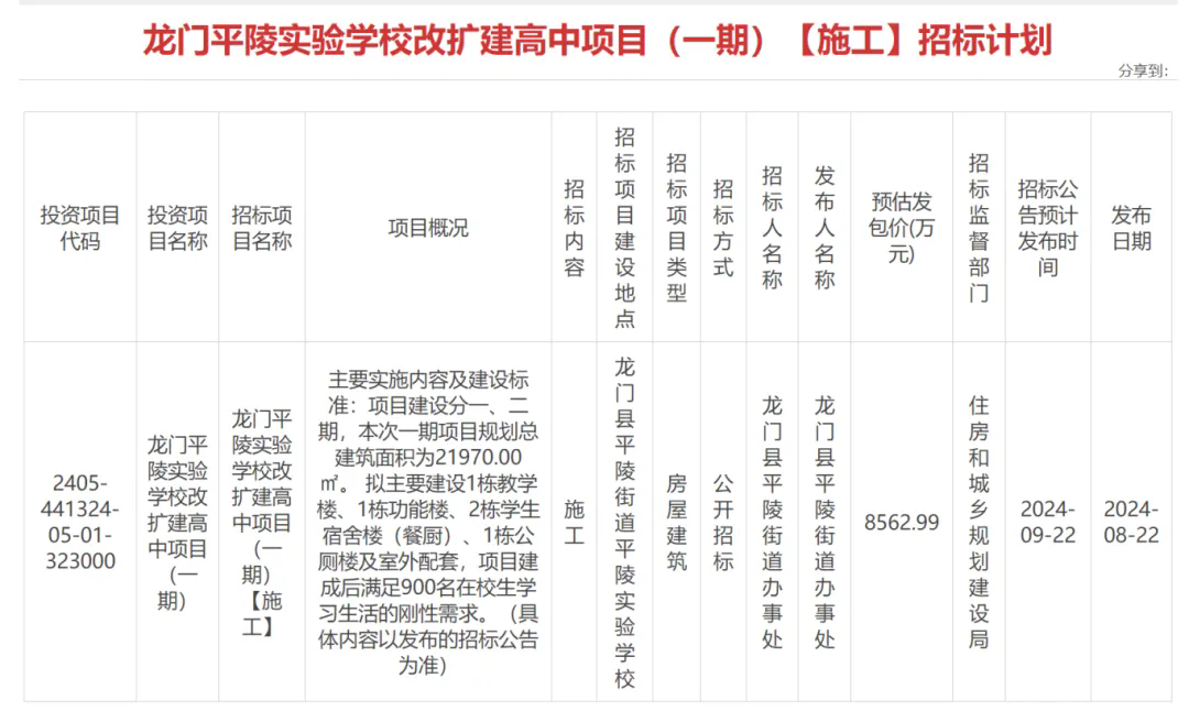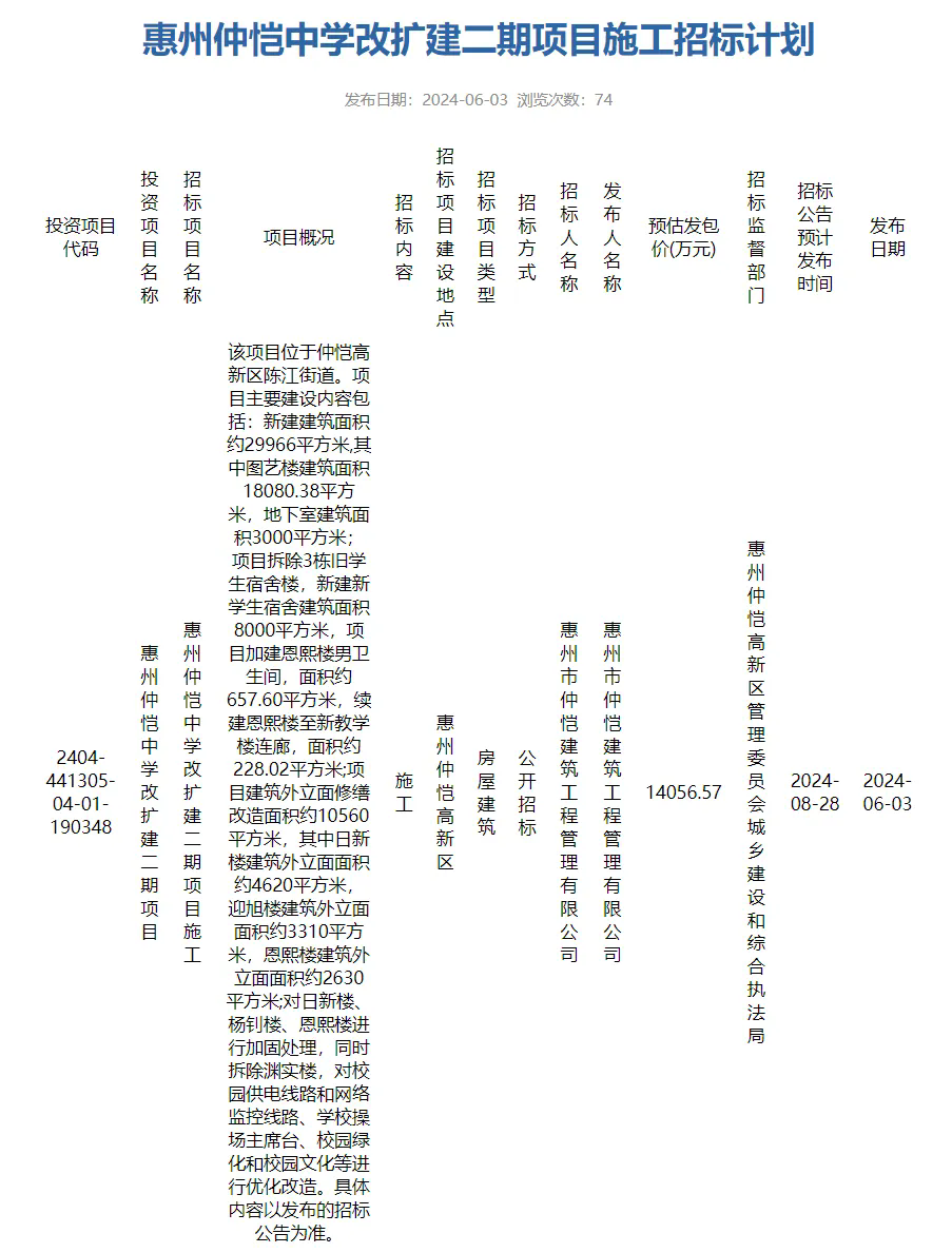 此外,惠州市公共資源交易中心還發(fā)布了龍門平陵實驗學校改擴建高中項目(一期)設(shè)計、施工和監(jiān)理招標計劃。