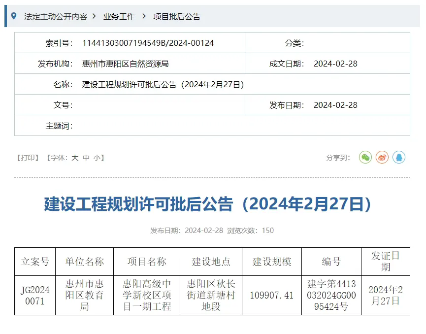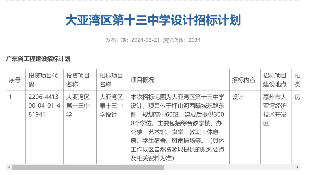2024年7月,惠州市自然資源局大亞灣分局發(fā)布了《大亞灣第七中學工規(guī)許可批前公示》。