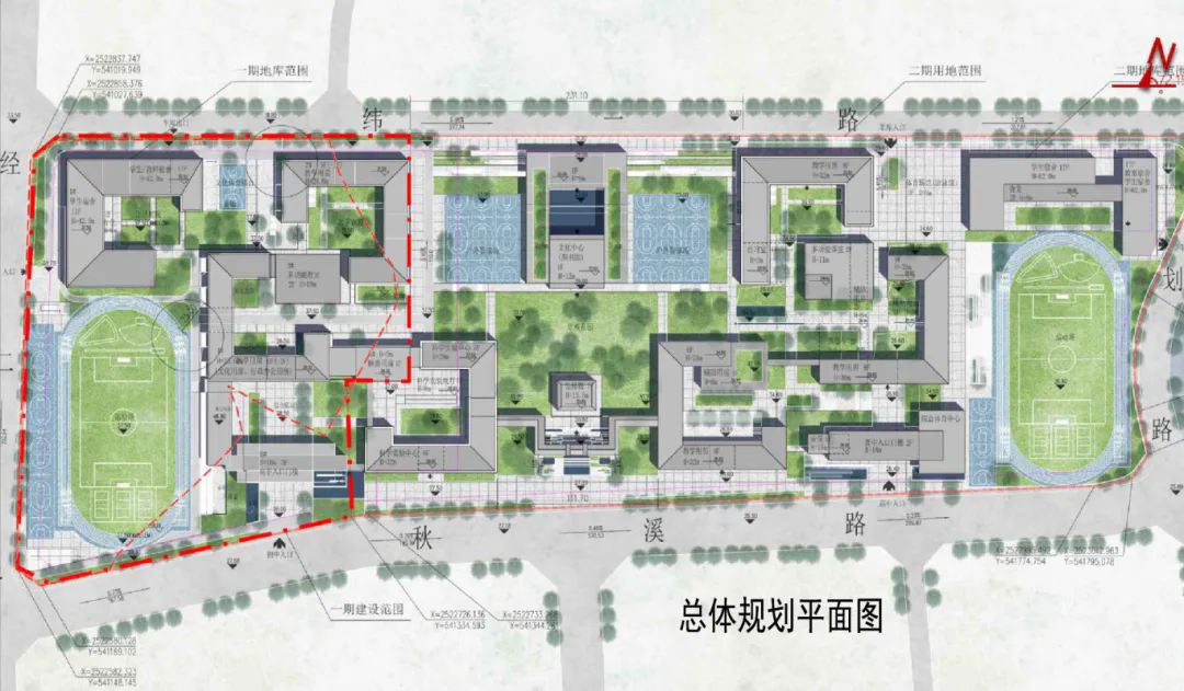 其中一期工程擬建60班高中及其它配套用房,用地面積72000㎡,總建筑面積109907.41㎡,計容積率建筑面積80213.31㎡,不計容建筑面積29694.1㎡,容積率1.11,建筑密度30%,綠地率35%,停車位300個。