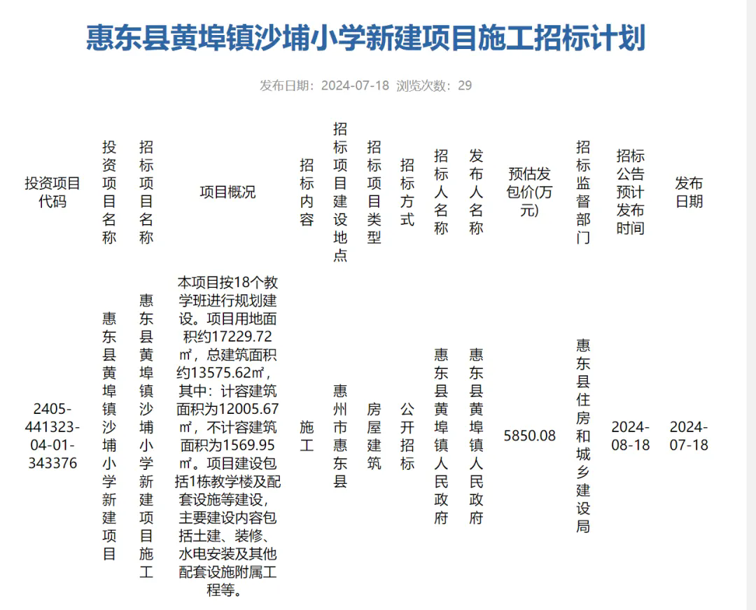 前段時間,惠州市公共資源交易中心發(fā)布惠東縣黃埠鎮(zhèn)沙埔小學新建項目施工招標計劃。