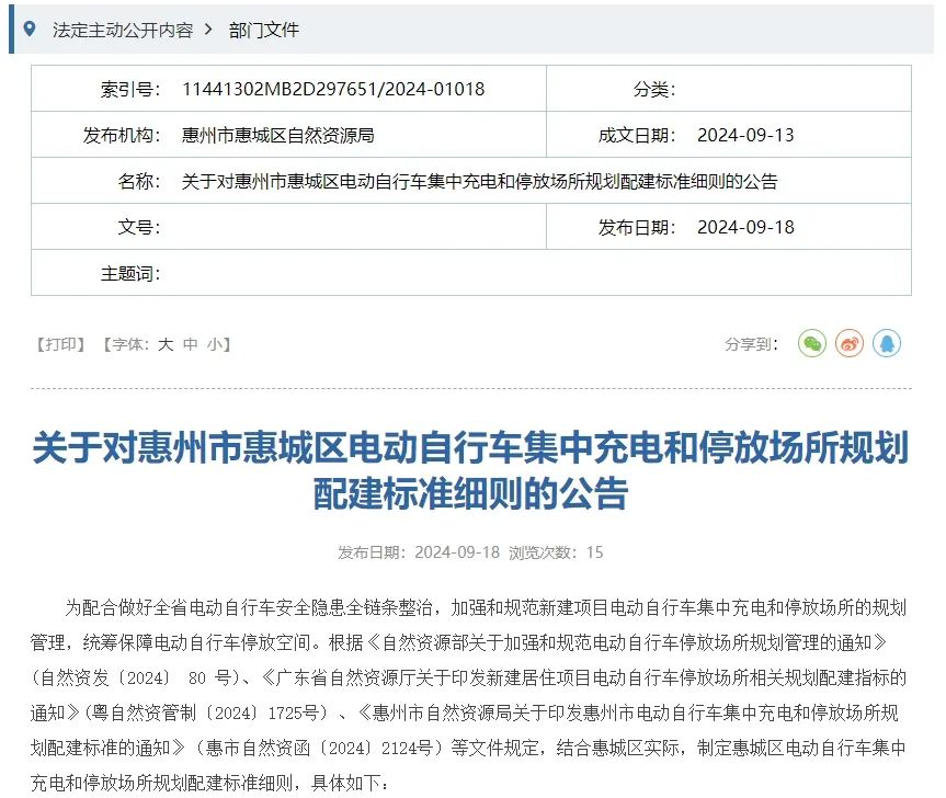 從公告可以知道,惠城區(qū)對(duì)新建建筑、商業(yè)、辦公、公園、綠化廣場(chǎng)、公共服務(wù)設(shè)施及工業(yè)建筑項(xiàng)目的電動(dòng)自行車的車位數(shù)量、停放區(qū)域、充電區(qū)域都有詳細(xì)要求。