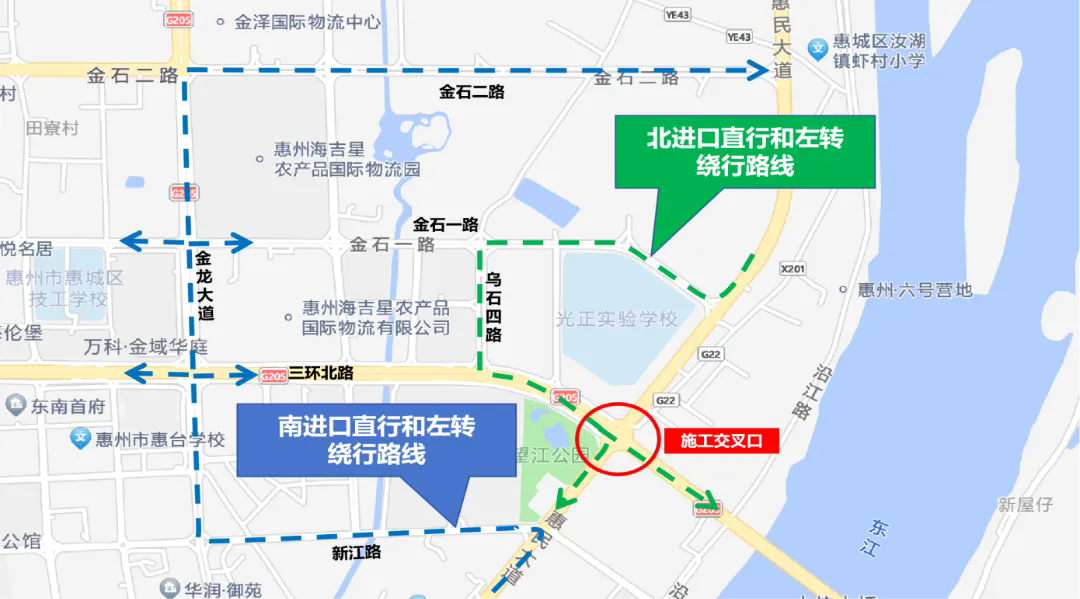 施工期間,原從北進口直行和左轉(zhuǎn)車輛,可通過金石一路→烏石四路→三環(huán)北路等道路繞行;原從南進口直行或左轉(zhuǎn)的車輛,可通過新江路→金龍大道等道路繞行。