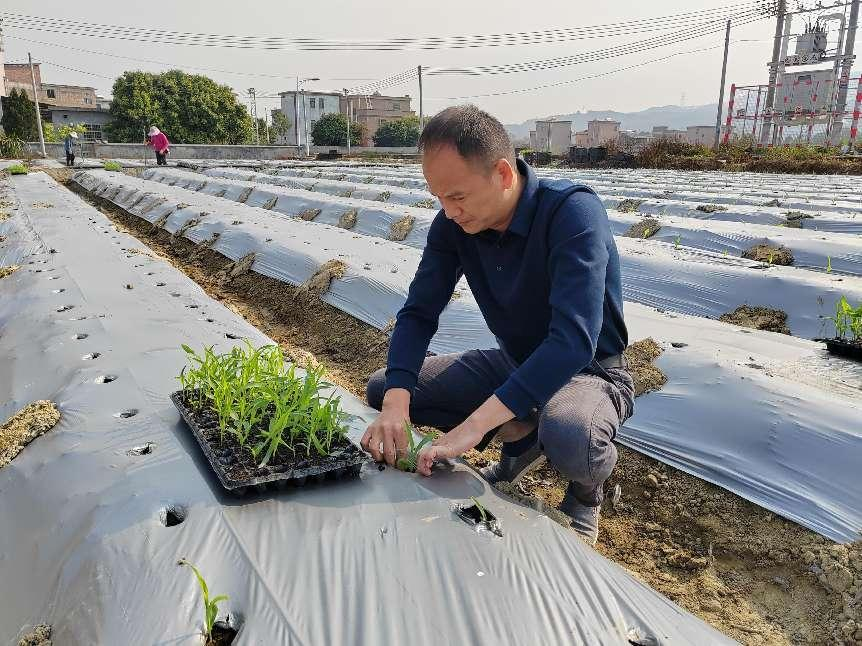 駐村干部第一批駐鎮(zhèn)幫鎮(zhèn)扶村隊員曾傳聲在鮮食玉米種植基地插下秧苗。