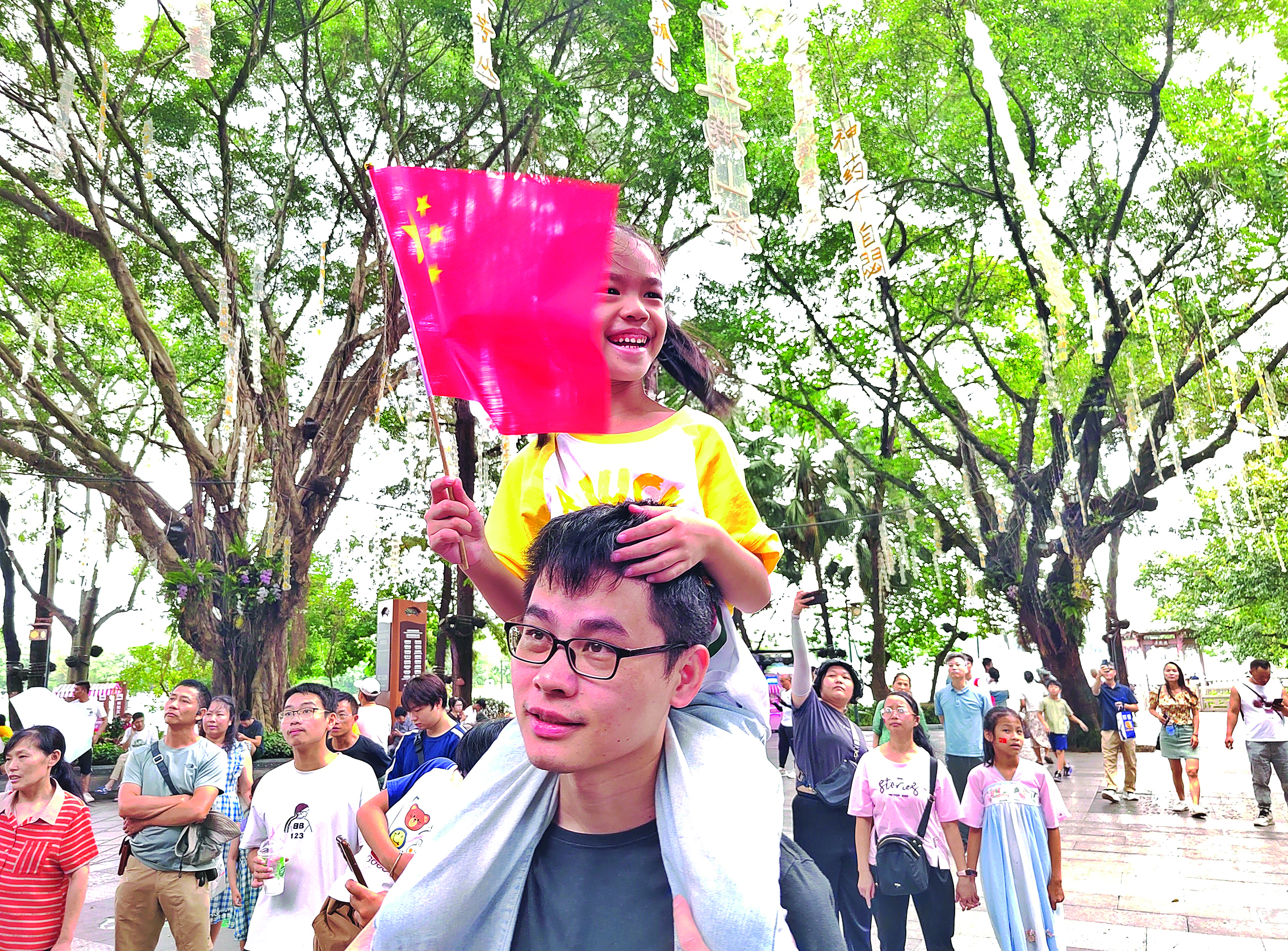 迎風(fēng)招展的五星紅旗,不僅點亮了城市的每個角落,更飄揚(yáng)在每個人心中。國慶節(jié)期間,人們以各種方式表達(dá)對祖國的熱愛與祝福,莊嚴(yán)的升旗儀式、熱鬧的慶祝活動、潮流的“快閃”合唱、與國旗同框合影、貼個五星紅旗臉貼……表達(dá)的都是對國家繁榮昌盛的自豪與驕傲,對美好生活的向往與追求。