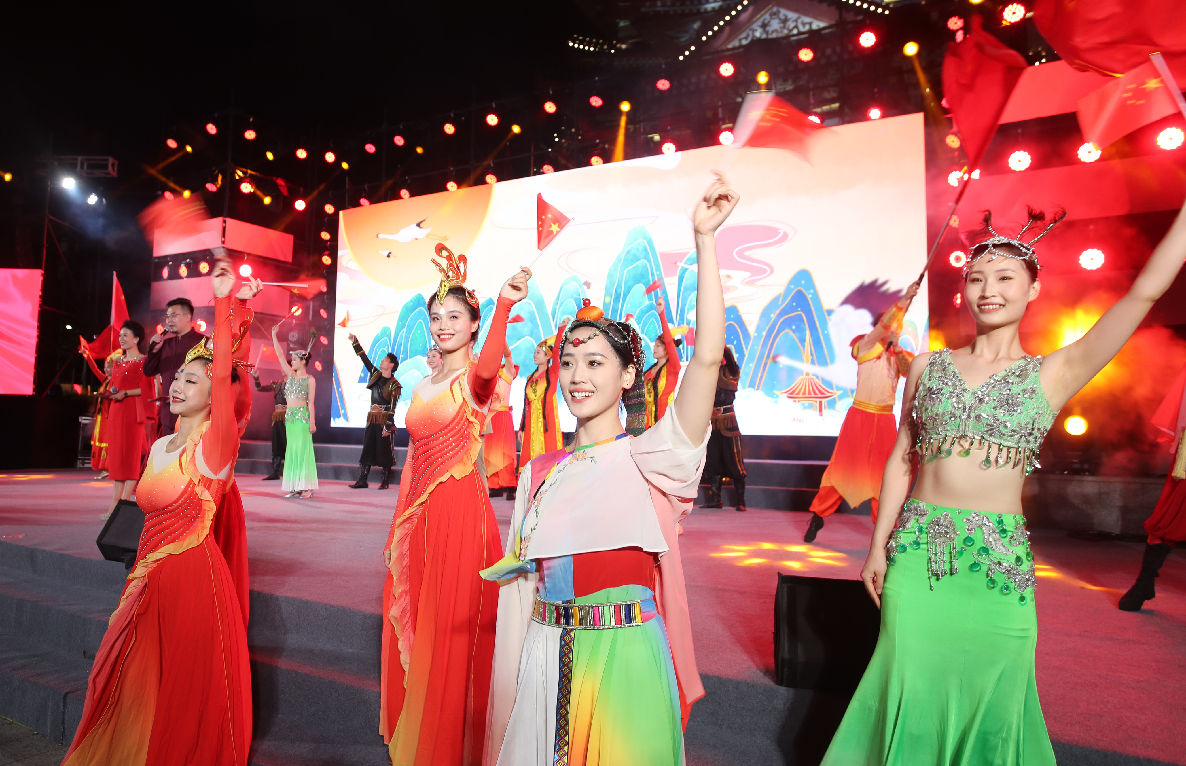 10月1日晚,“嶺南好味道·好吃在惠州”2024年國慶美食嘉年華暨“我和我的祖國”歲月留聲音樂會在水東街舉行,演員和觀眾齊聲高唱頌祖國。