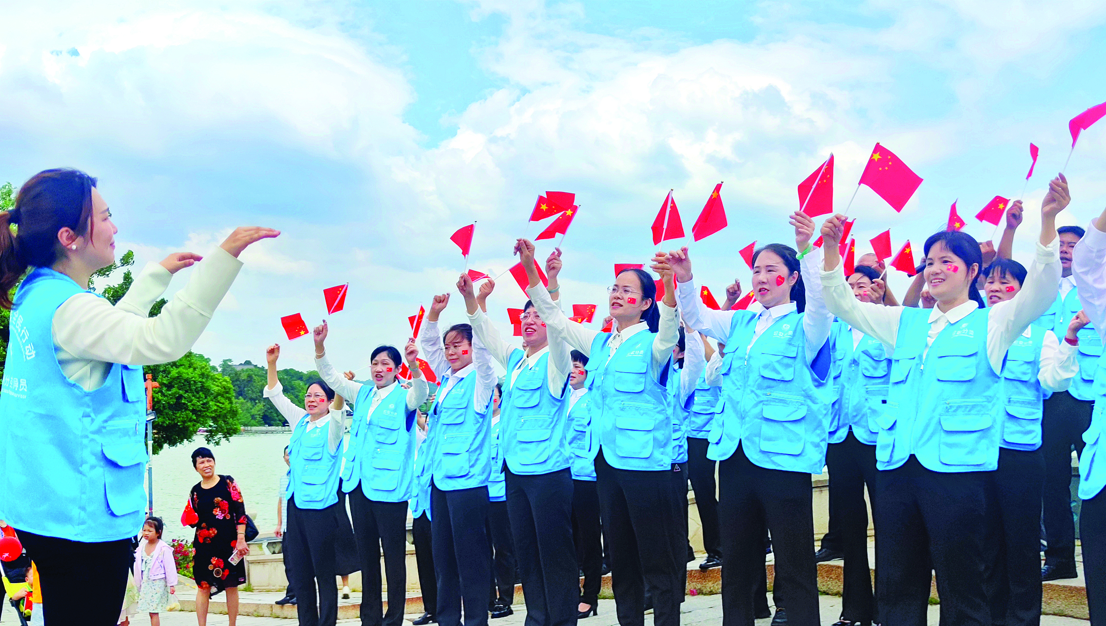 10月1日上午,惠州市市容環(huán)境衛(wèi)生事務(wù)中心鵝城清韻合唱團(tuán)在惠州西湖景區(qū)以快閃形式演唱《我和我的祖國》,用歌聲深情表白祖國。