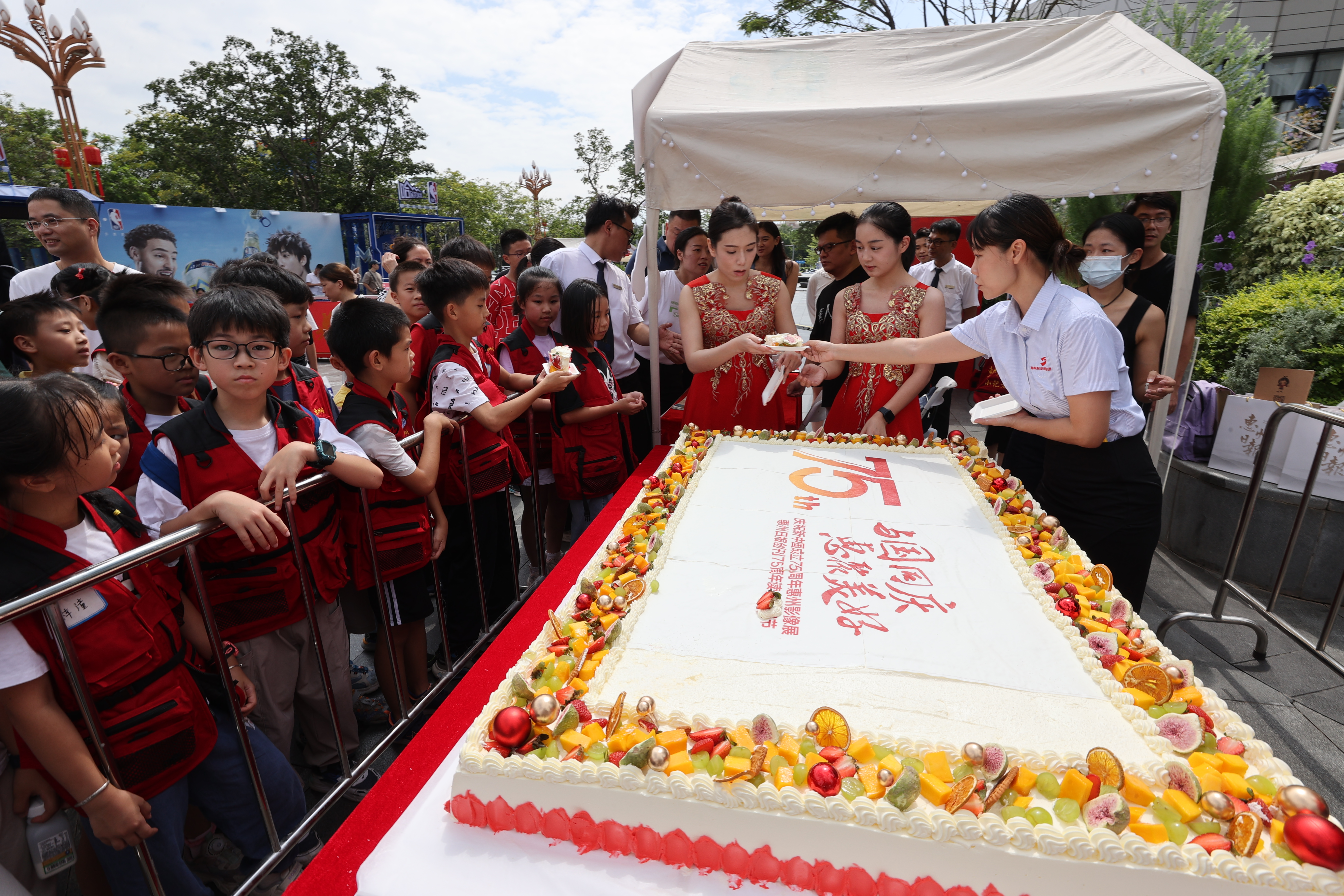 惠州日?qǐng)?bào)社邀請(qǐng)市民讀者共同分享75寸大蛋糕。