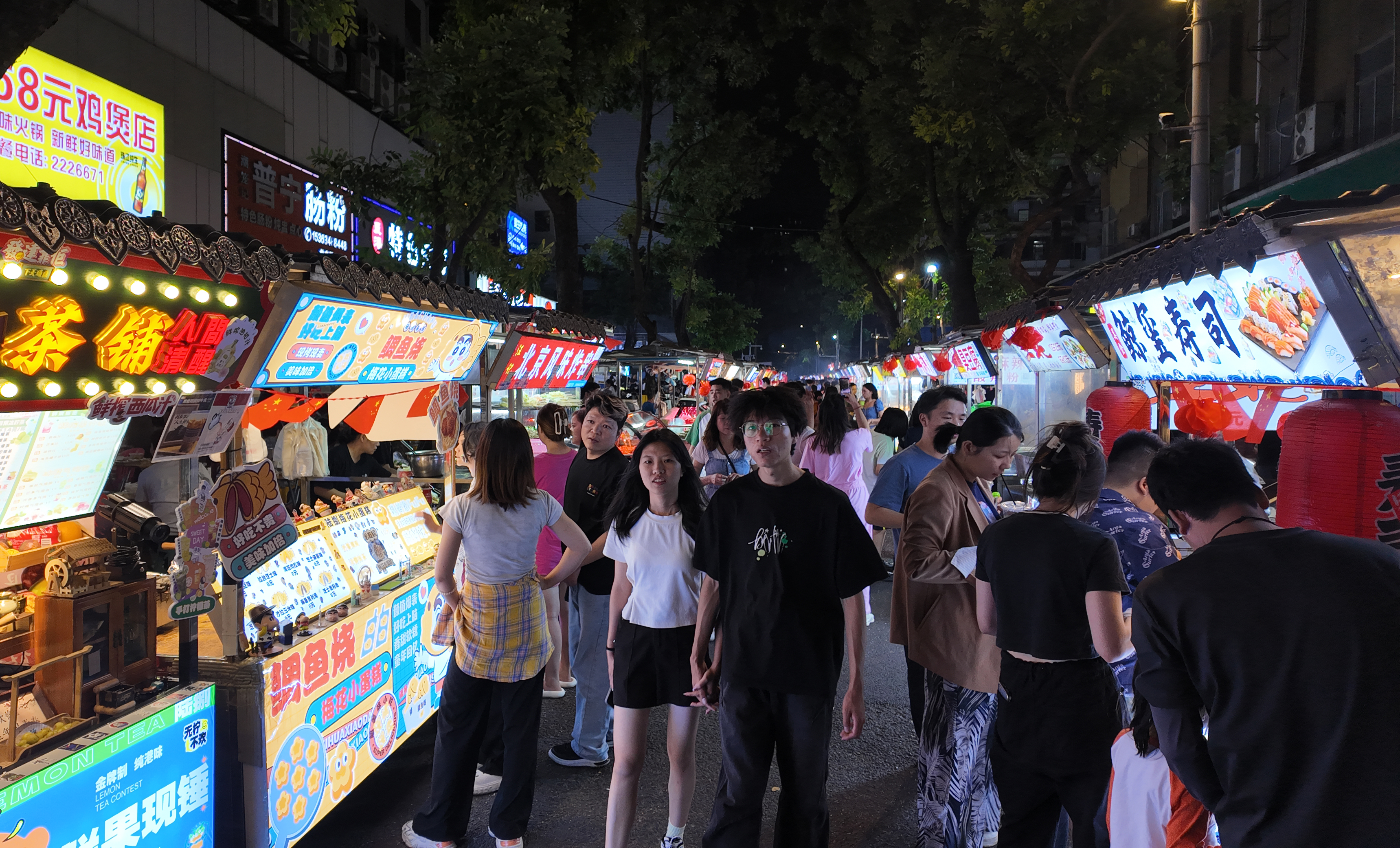 在市區(qū)河南岸小吃街、龍豐夜市,匯聚各式小吃,小龍蝦、鐵板魷魚、鴨脖……這里總有一種美食能讓你胃口大開。這些地方因而成為市民爭(zhēng)相休閑打卡好去處。人頭攢動(dòng)中,市民消費(fèi)熱情高漲,攤主忙得不亦樂乎。