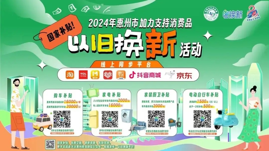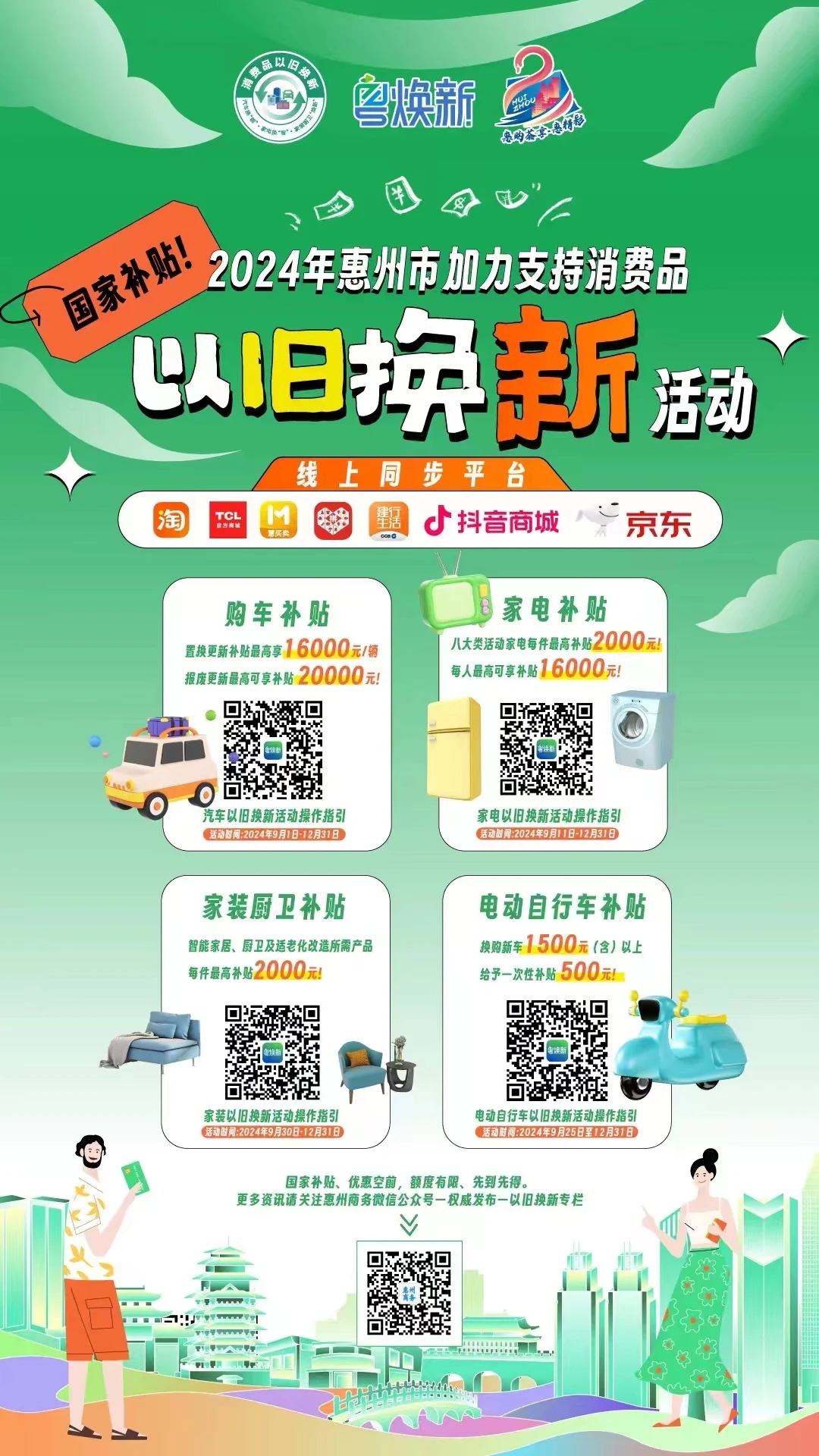 以舊換新的“補貼潮”,如今也正“潮涌”惠州消費市場,為了進一步激發(fā)“換”經(jīng)濟的“新”熱情,從本月(9月)起,惠州市啟動了新一輪更大力度的消費品“以舊換新”工作,優(yōu)惠補貼覆蓋汽車、家電、家裝廚衛(wèi)、電動自行車等諸多領(lǐng)域,產(chǎn)品選擇性更廣、補貼比例更高。