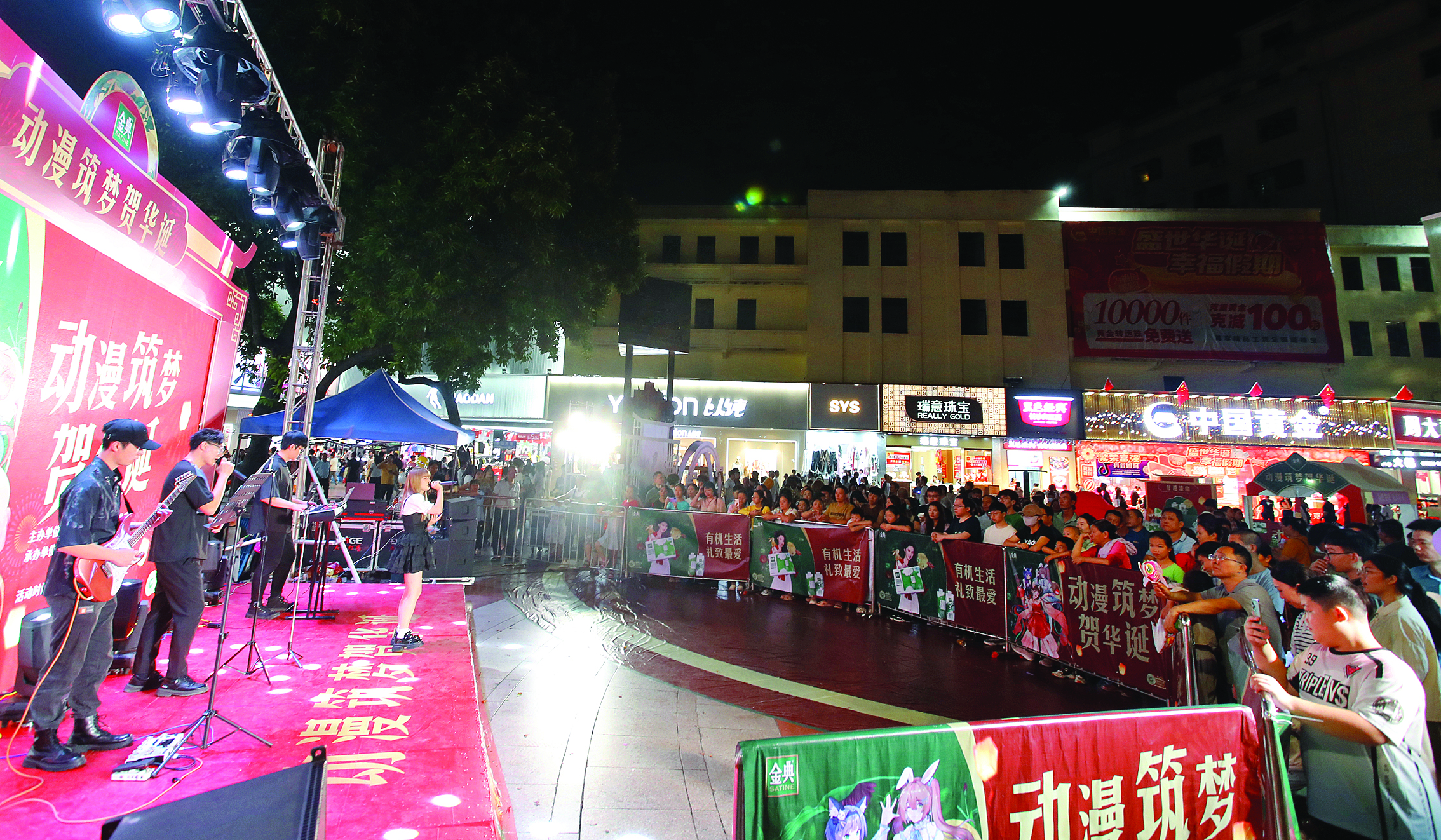 在惠州商業(yè)步行街,眾多市民圍觀樂隊(duì)表演。