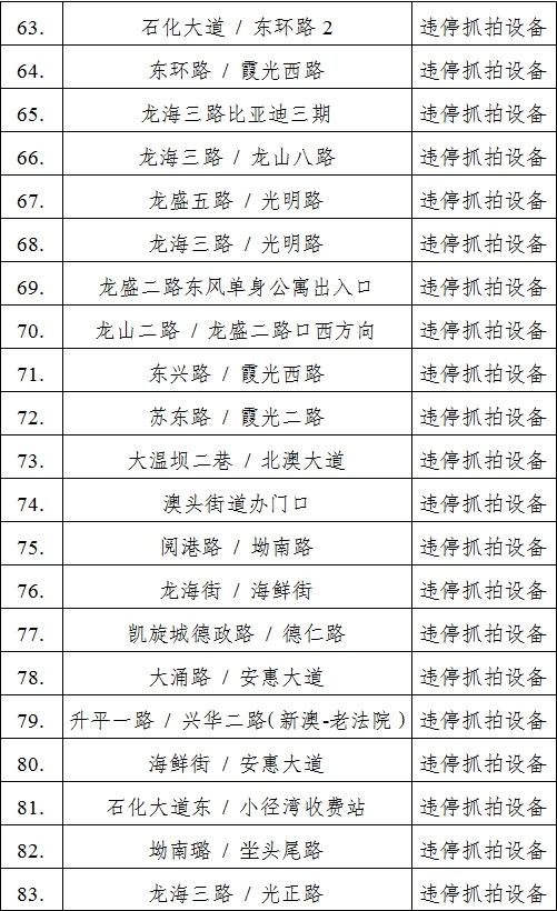 根據(jù)《中華人民共和國行政處罰法》第四十一條及《道路交通安全違法行為處理程序規(guī)定》第十六條關(guān)于“固定式交通技術(shù)監(jiān)控設(shè)備地點(diǎn)應(yīng)向社會公布”的規(guī)定,惠州市轄區(qū)范圍內(nèi)近期啟用的視頻監(jiān)控點(diǎn)位公布,具體如下: