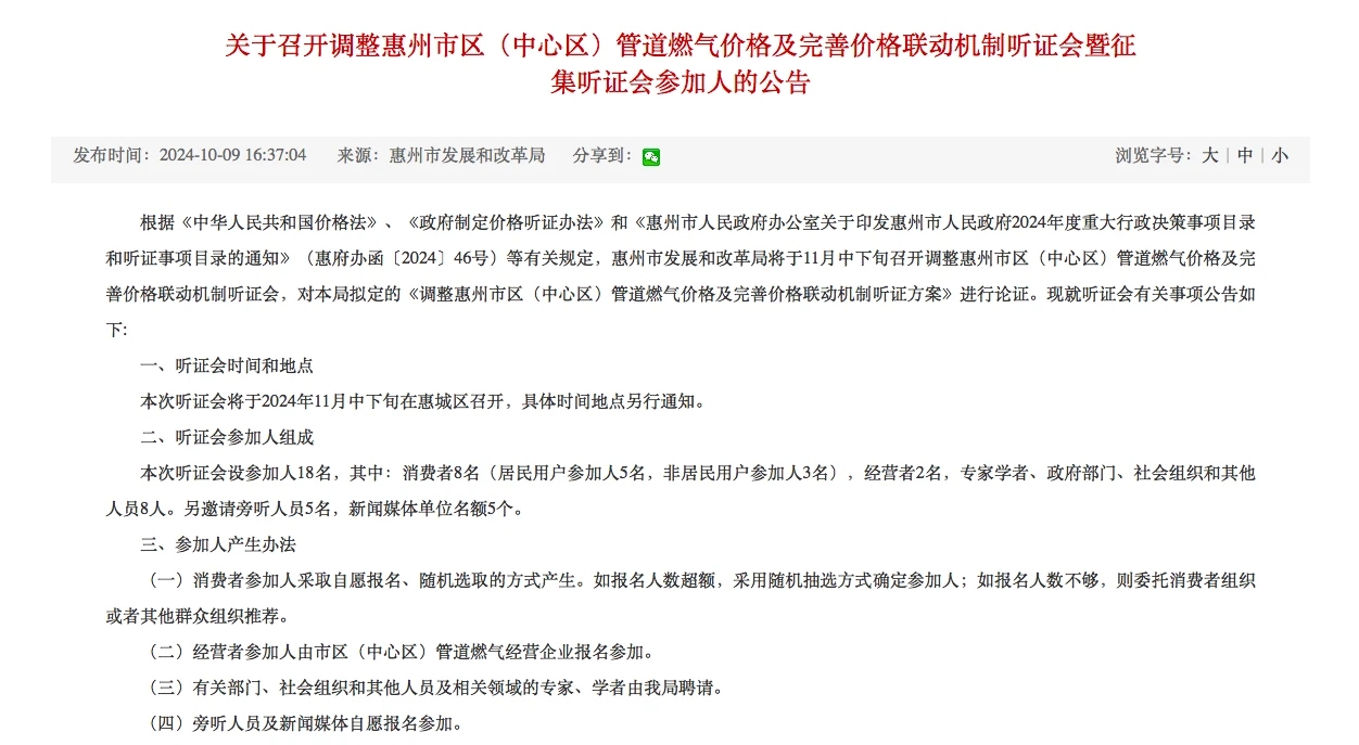 市發(fā)展改革局相關負責人介紹,聽證會將于2024年11月中下旬在惠城區(qū)召開,具體時間地點另行通知。屆時將設18名聽證會參加人員,分別為消費者8名,其中居民用戶參加人5名,非居民用戶參加人3名;經營者2名;專家學者、政府部門、社會組織和其他人員8名。另邀請旁聽人員5名,并設新聞媒體單位名額5個。參加人員報名時間為10月10日至21日。