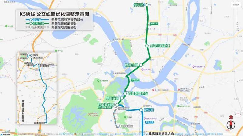 根據(jù)優(yōu)化調(diào)整內(nèi)容,將取消K5快線行駛鵝嶺南路至汽車總站路段,取消龍豐市場、汽車總站2個站點,改由飛鵝嶺公園延伸經(jīng)鵝嶺北路、環(huán)城西路、惠州大橋、云山西路、惠州大道至火車站。