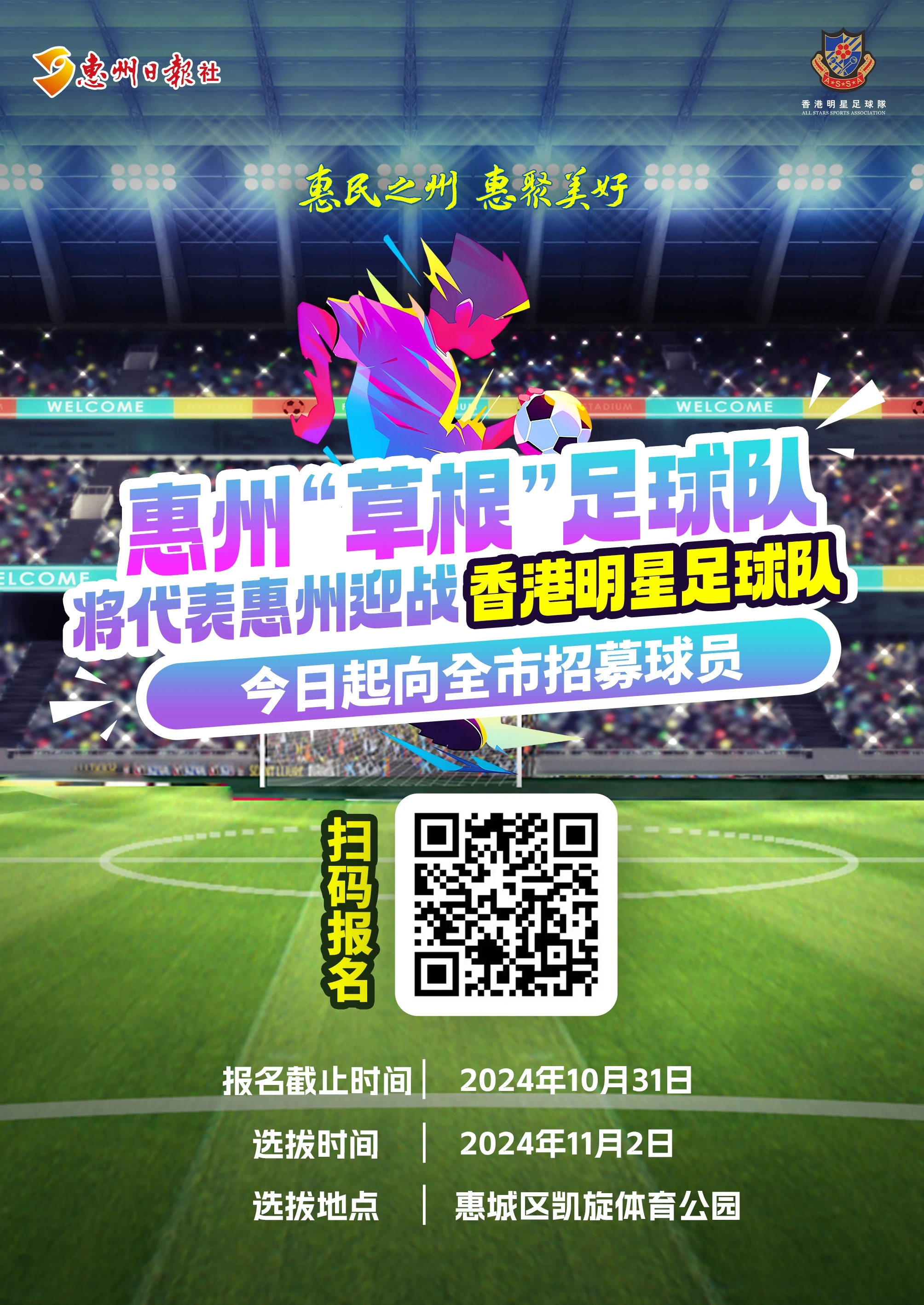 目前,惠州“草根”足球隊(duì)隊(duì)員持續(xù)招募中。不限年齡、職業(yè)、性別,只要你是熱愛足球、擁有一定的足球技能和潛力的非職業(yè)足球運(yùn)動(dòng)員,都可以報(bào)名參加本次比賽。賽事報(bào)名截止時(shí)間為10月31日,感興趣的可關(guān)注“惠州日?qǐng)?bào)”微信公眾號(hào)或掃描二維碼報(bào)名,香港明星足球隊(duì)惠州公益邀請(qǐng)賽等你來戰(zhàn)。