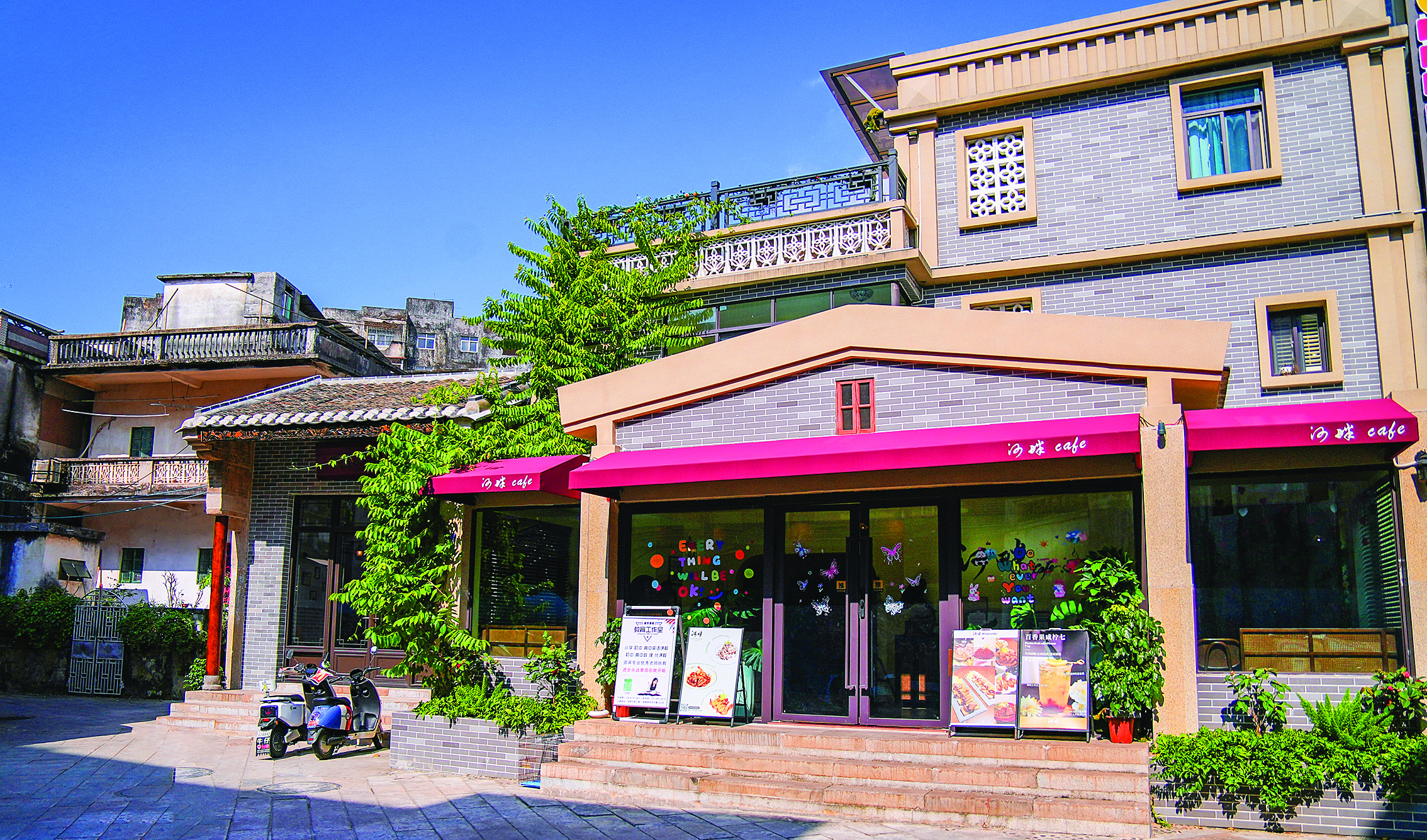 來到惠州惠陽淡水老街的入口,轉(zhuǎn)個彎就能遇到一棟南洋復(fù)古風(fēng)的小洋樓,旁邊還有一個古色古香的小院,因?yàn)榭拷优希昝〉靡脖容^接地氣:“河畔cafe”“河畔小院”。