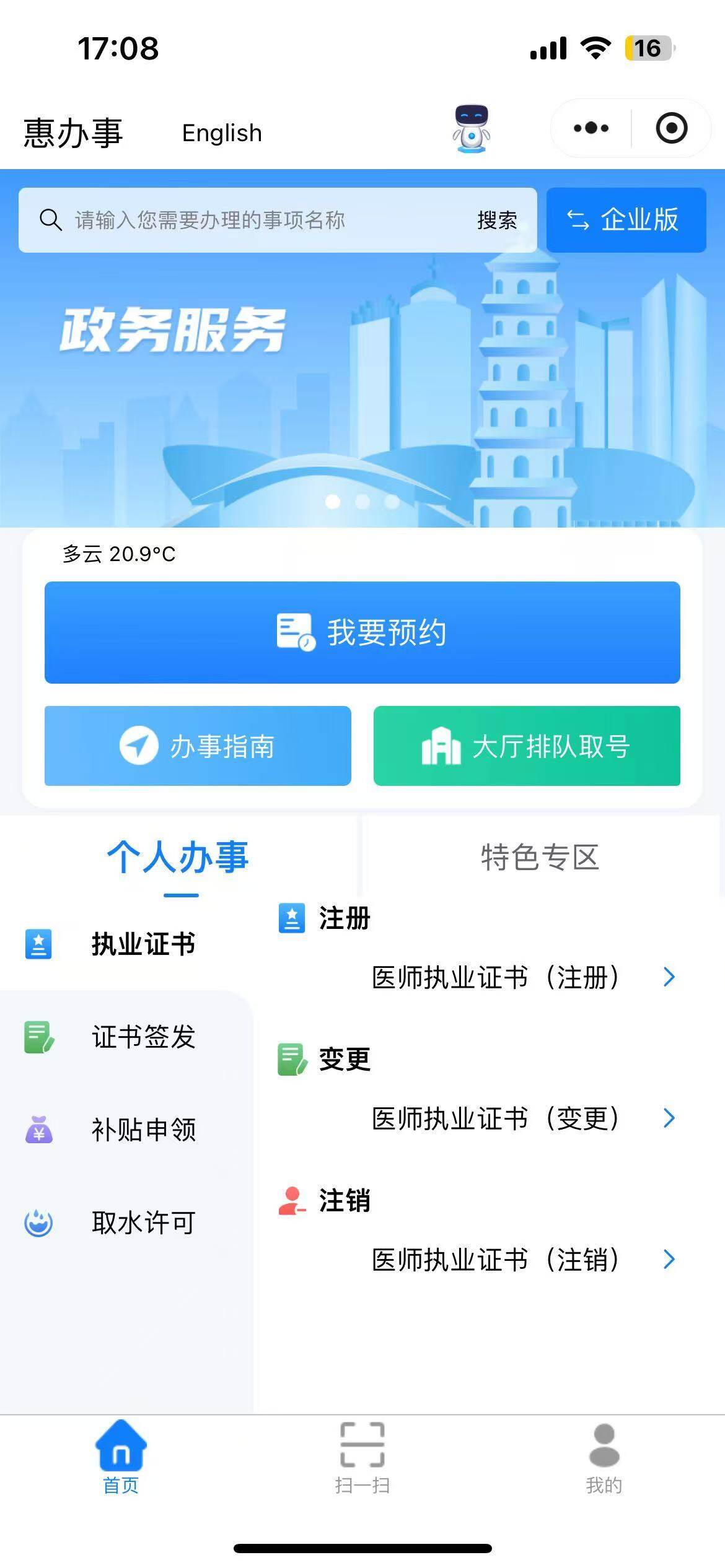 在微信小程序搜索“惠辦事”,便能找到“惠辦事”小程序,點(diǎn)擊進(jìn)入,只見(jiàn)頁(yè)面清新簡(jiǎn)潔,“我要預(yù)約”“辦事指南”“大廳排隊(duì)取號(hào)”“個(gè)人辦事”“特色服務(wù)”,五大主要模塊清晰顯眼。