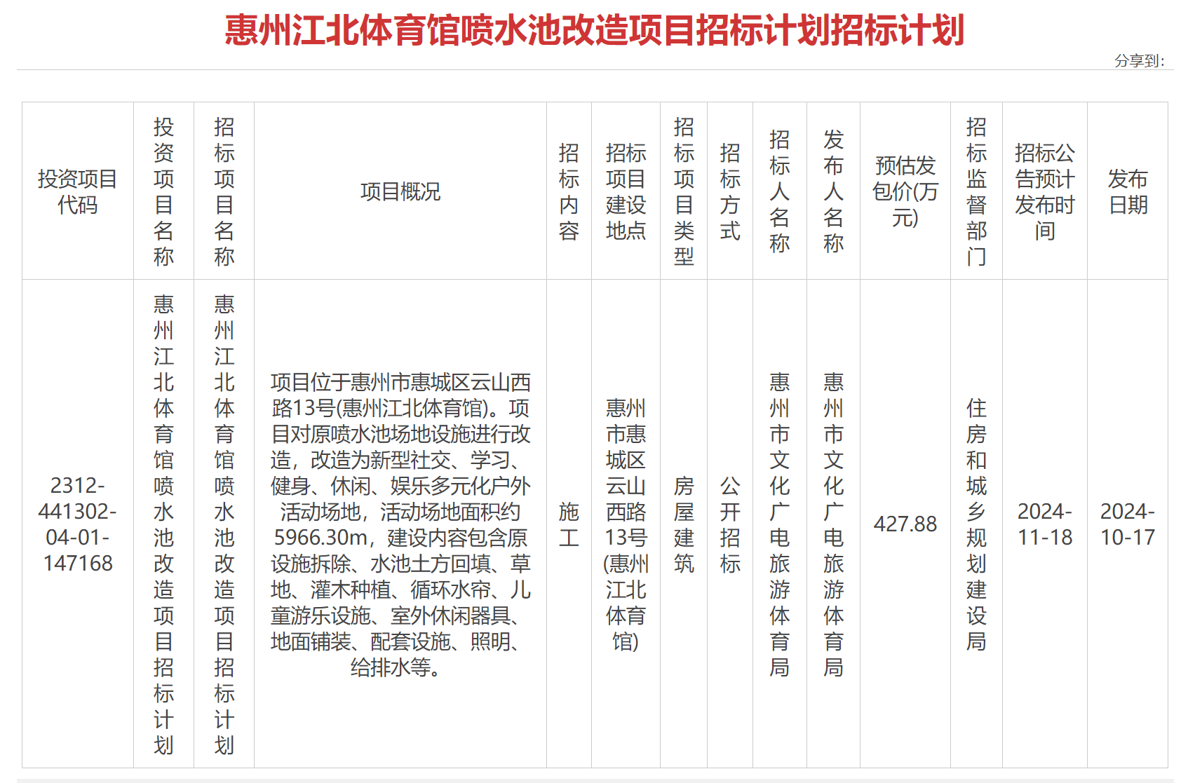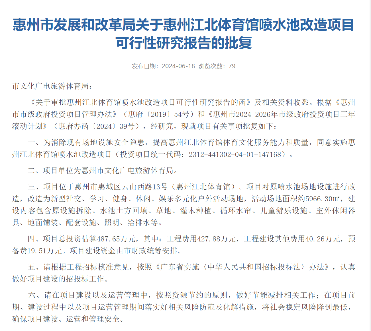 實(shí)際上在今年6月份,惠州市發(fā)展和改革局就發(fā)布《關(guān)于惠州江北體育館噴水池改造項(xiàng)目可行性研究報(bào)告的批復(fù)》。