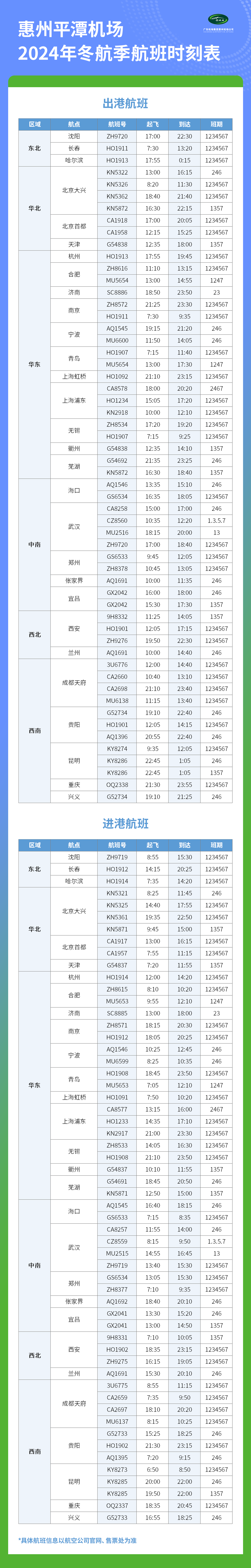 惠州平潭機場2024年冬春航季航班時刻表