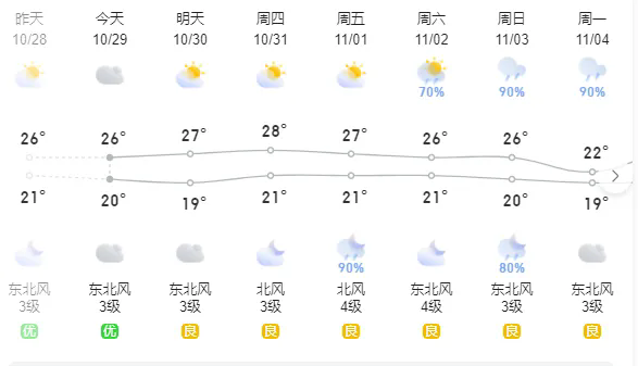 預(yù)計(jì),今天白天我市各地多云間陰天,最高氣溫27℃左右;30日,多云到晴天,最低氣溫19~21℃,最高氣溫28℃左右;31日-11月2日,晴朗干燥,最低氣溫17~20℃,最高氣溫28~30℃;3-4日,多云為主。