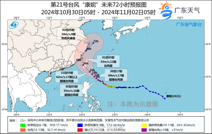 據(jù)廣東天氣29日11時(shí)的消息,今年第21號臺(tái)風(fēng)“康妮”(臺(tái)風(fēng)級)強(qiáng)度逐漸增強(qiáng),最強(qiáng)可達(dá)強(qiáng)臺(tái)風(fēng)級或超強(qiáng)臺(tái)風(fēng)級(48-55米/秒,15~16級),并將于31日中午到傍晚在臺(tái)灣島南部沿海登陸,隨后穿過臺(tái)灣島進(jìn)入臺(tái)灣海峽,登陸或擦過福建沿海地區(qū),隨后轉(zhuǎn)向偏東北方向。