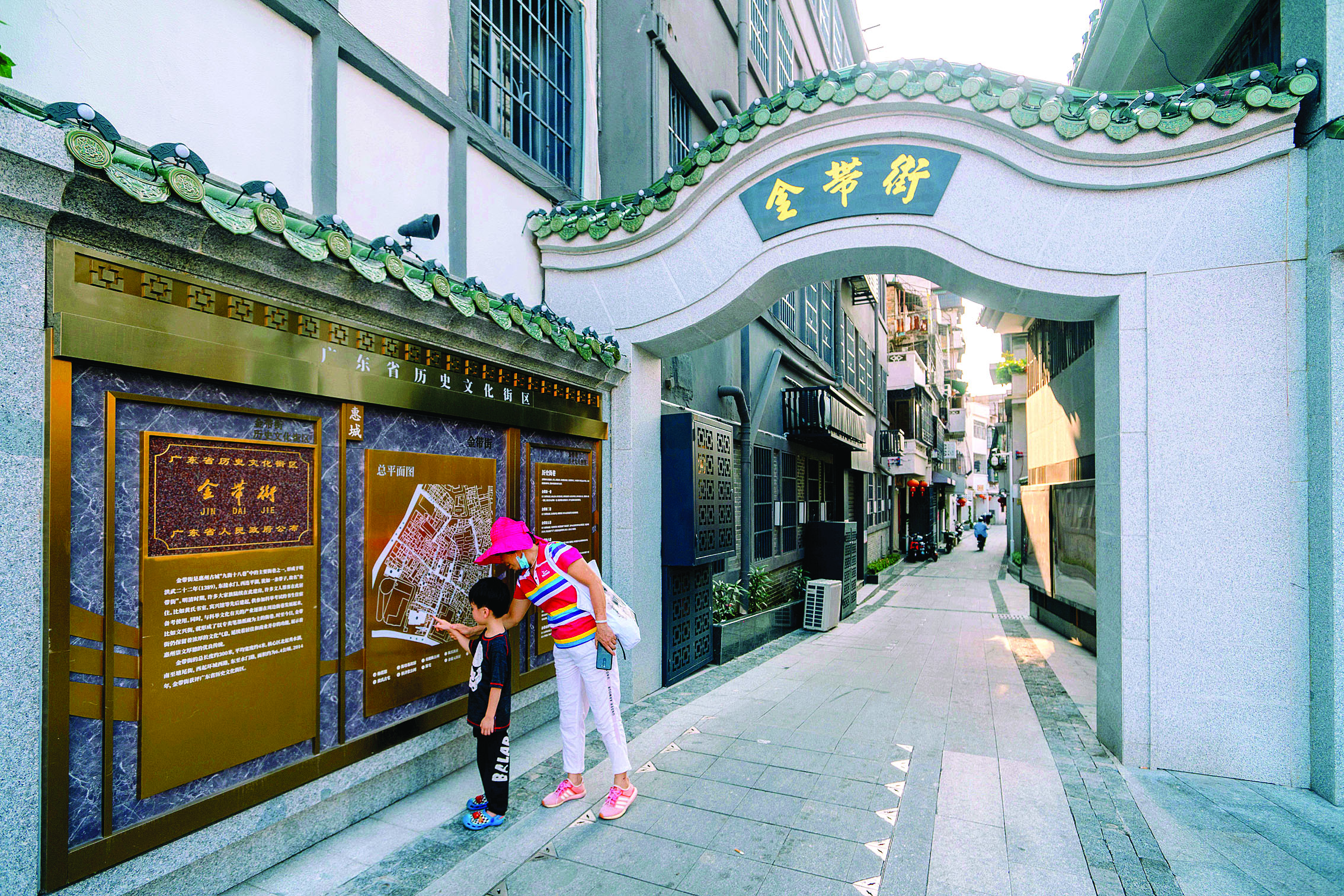整治提升后,金帶街以灰、白為主要色調(diào)統(tǒng)一沿街建筑風(fēng)貌,主街路面鋪設(shè)青石板,根據(jù)以往門樓線條重建東、西新門樓,結(jié)合金帶街文化,改善居民生活空間,讓歷史文化與現(xiàn)代生活融為一體。與金帶街隔江相望、因水而興的水東街(二期),也在微改造中重現(xiàn)嶺南騎樓風(fēng)情,并通過(guò)銅雕、老字號(hào)招牌等元素還原明清時(shí)期水東街繁盛的商埠文化,留住城市記憶。