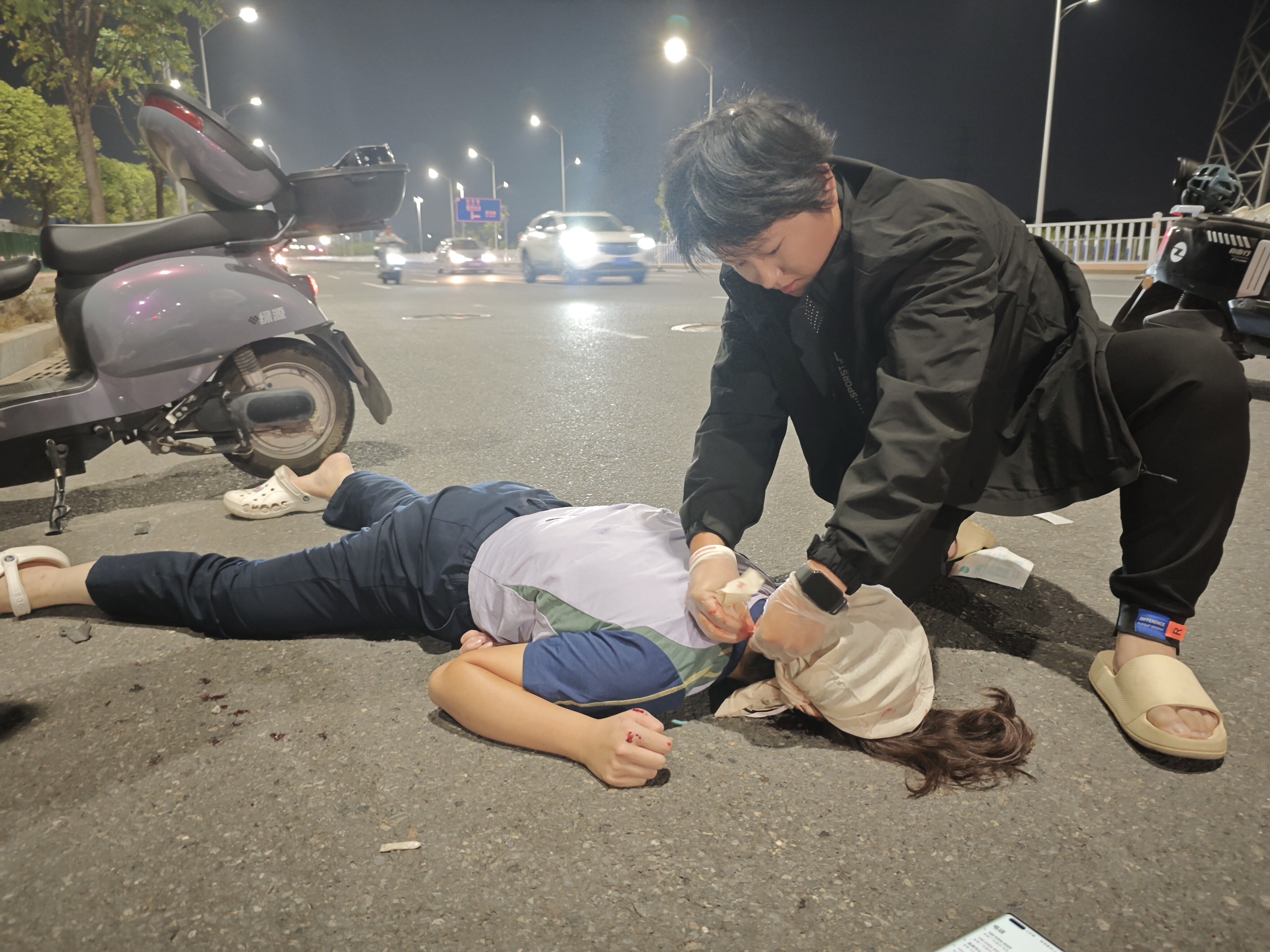 10月30日下午6時(shí)30分許,夜幕降臨,贛深高鐵惠州北站出口白石路段,一女子駕駛電動(dòng)車載著一名小男孩,發(fā)生車禍,兩人摔倒在地,其中女子頭部受傷流血。所幸的是,路過此地的惠州市惠城區(qū)蛟龍應(yīng)急救援中心志愿者張丹丹及時(shí)出手,對(duì)他們進(jìn)行急救,并送至救護(hù)車。