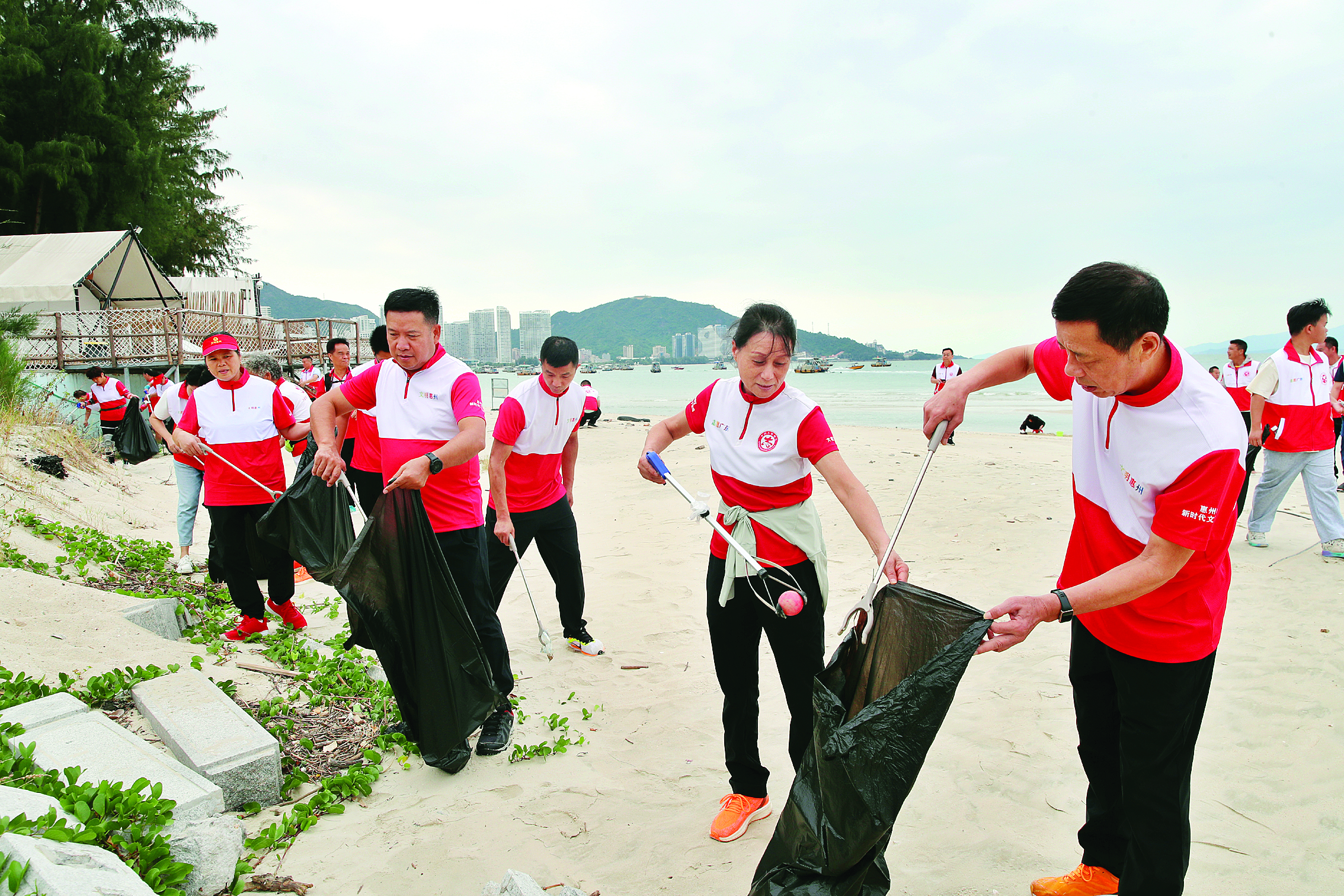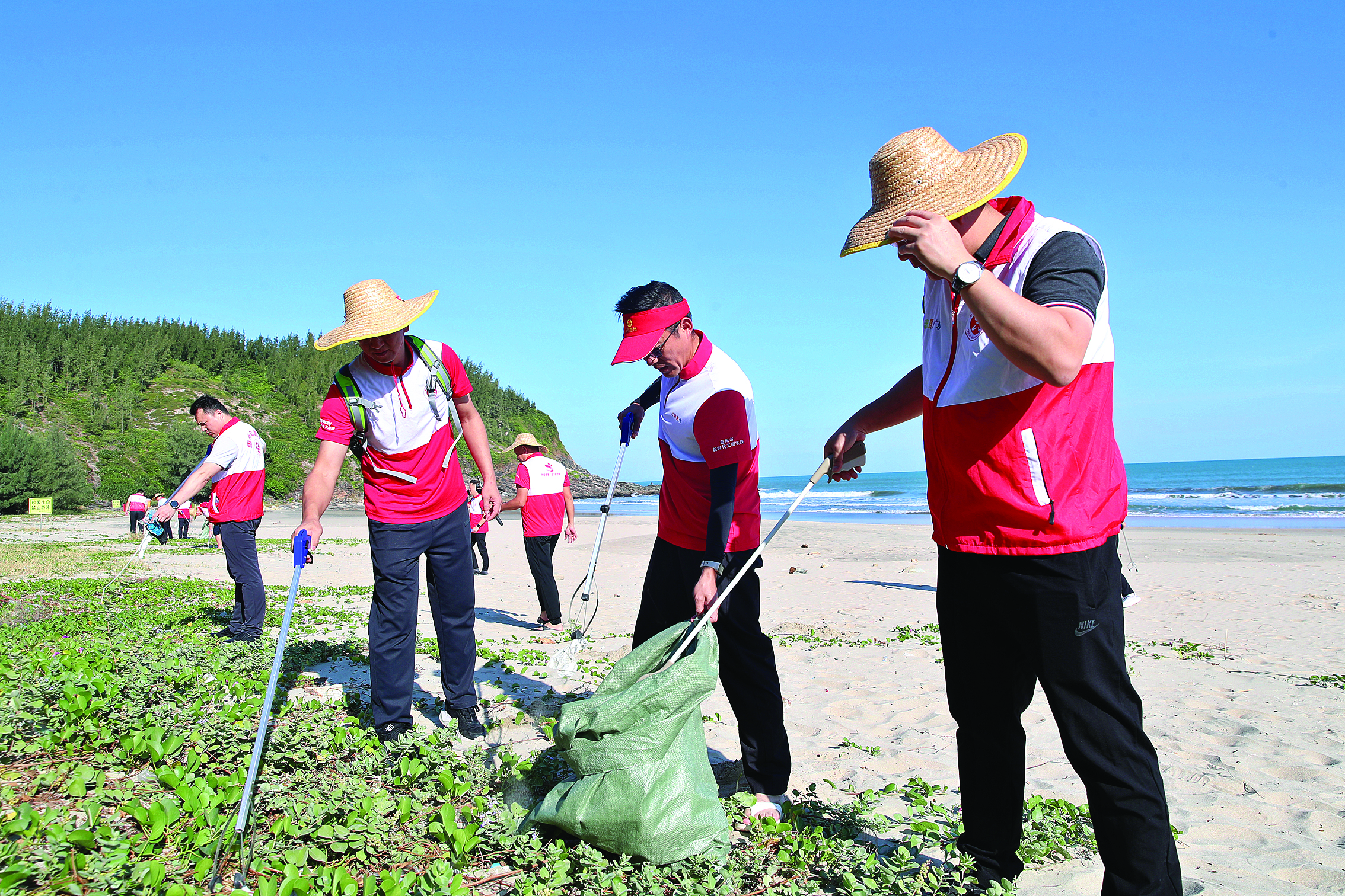志愿者在惠東黃埠鎮(zhèn)黑排角海灘撿垃圾。惠州日?qǐng)?bào)記者鐘暢新 攝