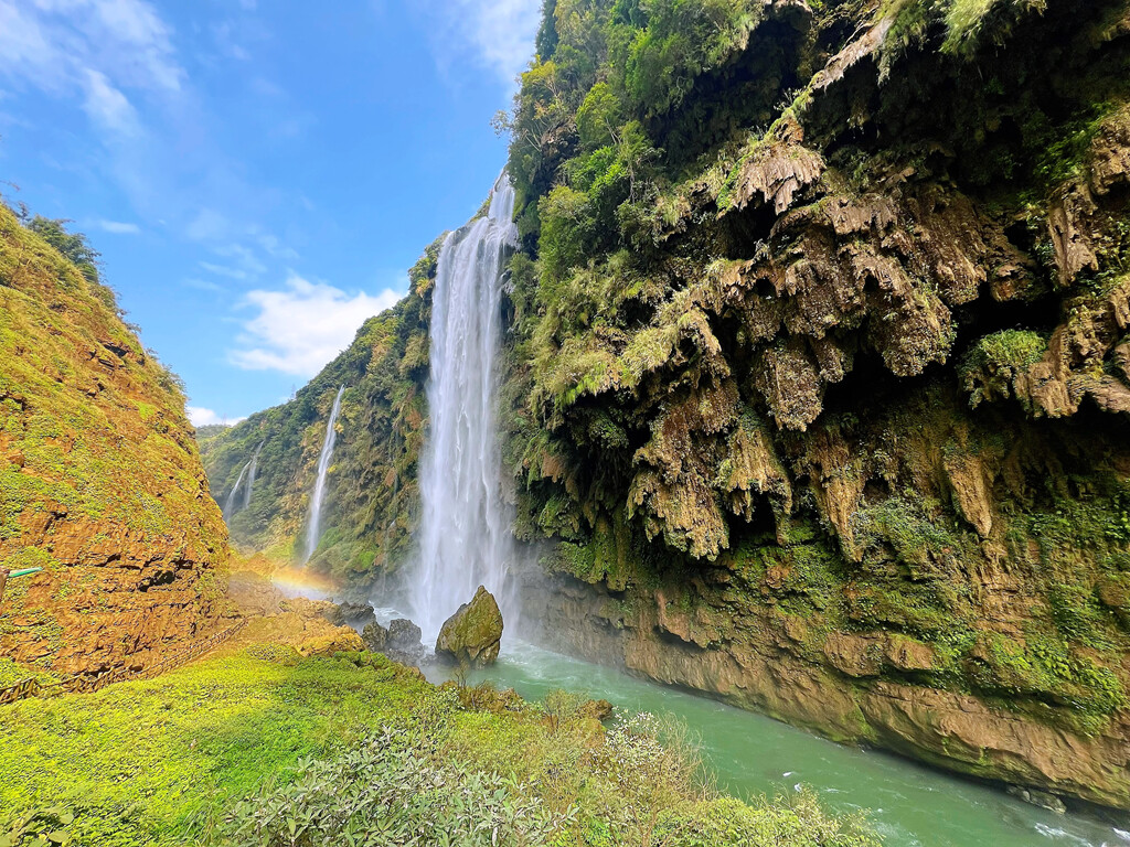 馬嶺河峽谷是喀斯特多層次地貌景觀的集中表現(xiàn),集雄、奇、險(xiǎn)、秀、幽、壯、美于一體,谷底空氣負(fù)氧離子含量最高可達(dá)到30萬/立方厘米。這個(gè)“地球上最壯觀最美麗的城市峽谷”,多條瀑布從落差200多米的懸崖傾瀉而下,聲震如雷,水霧彌漫。宏偉壯觀的瀑布群下,有30萬平方米的巖頁壁掛分布在峽谷的兩岸,它們一蓬蓬地附掛在峭壁上,有的像靈芝,有的像木耳,有的像雄鷹展翅,有的像荷葉伸展,極具觀賞價(jià)值、研學(xué)價(jià)值和科考價(jià)值。