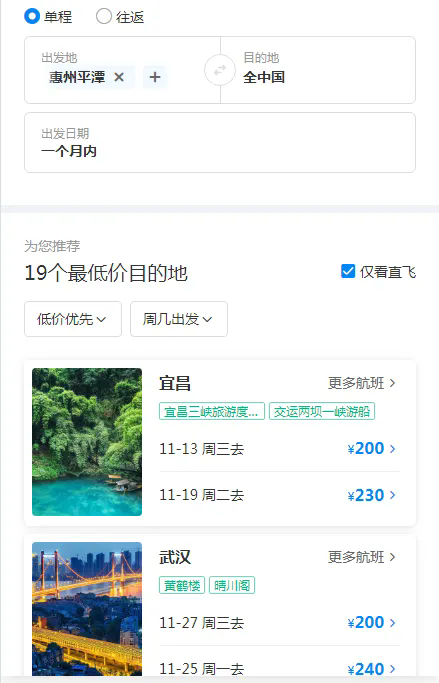 未來(lái)一個(gè)月惠州直飛多地機(jī)票