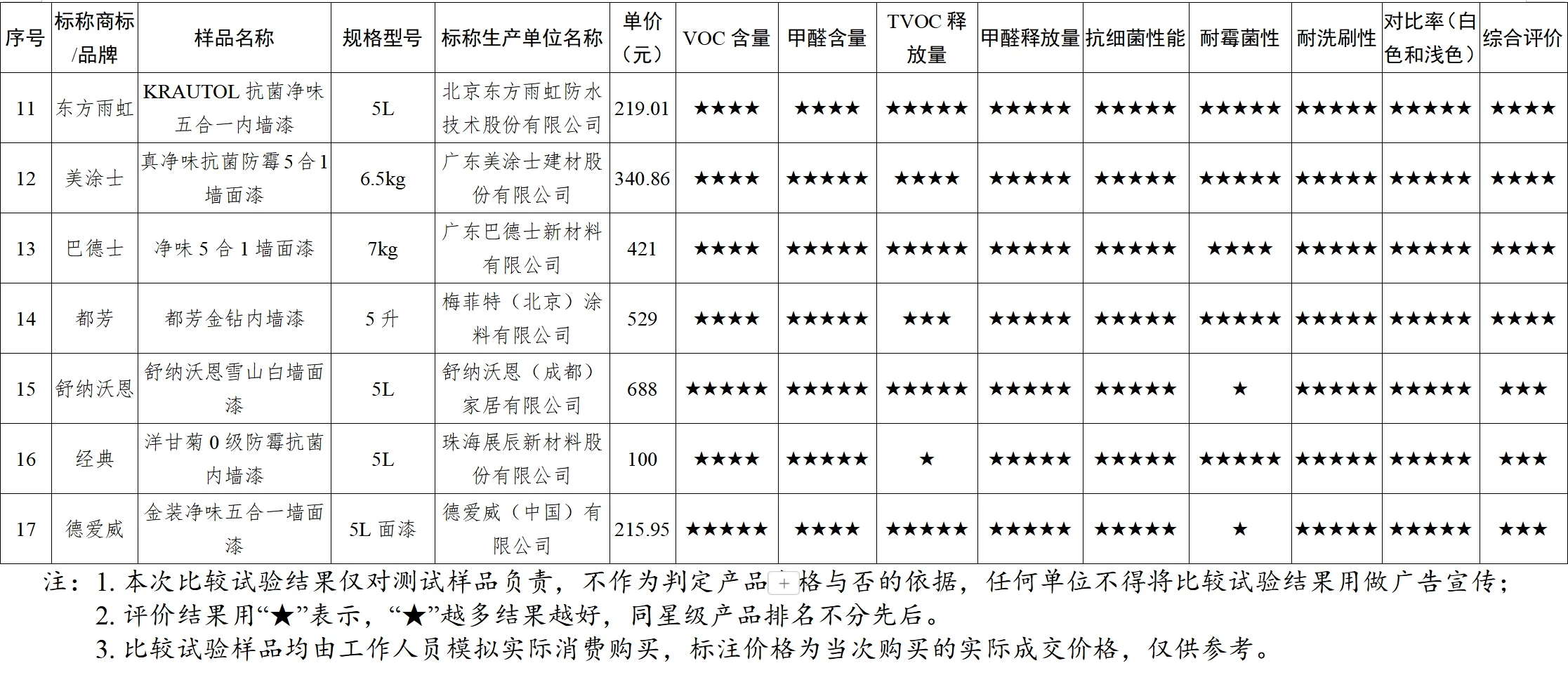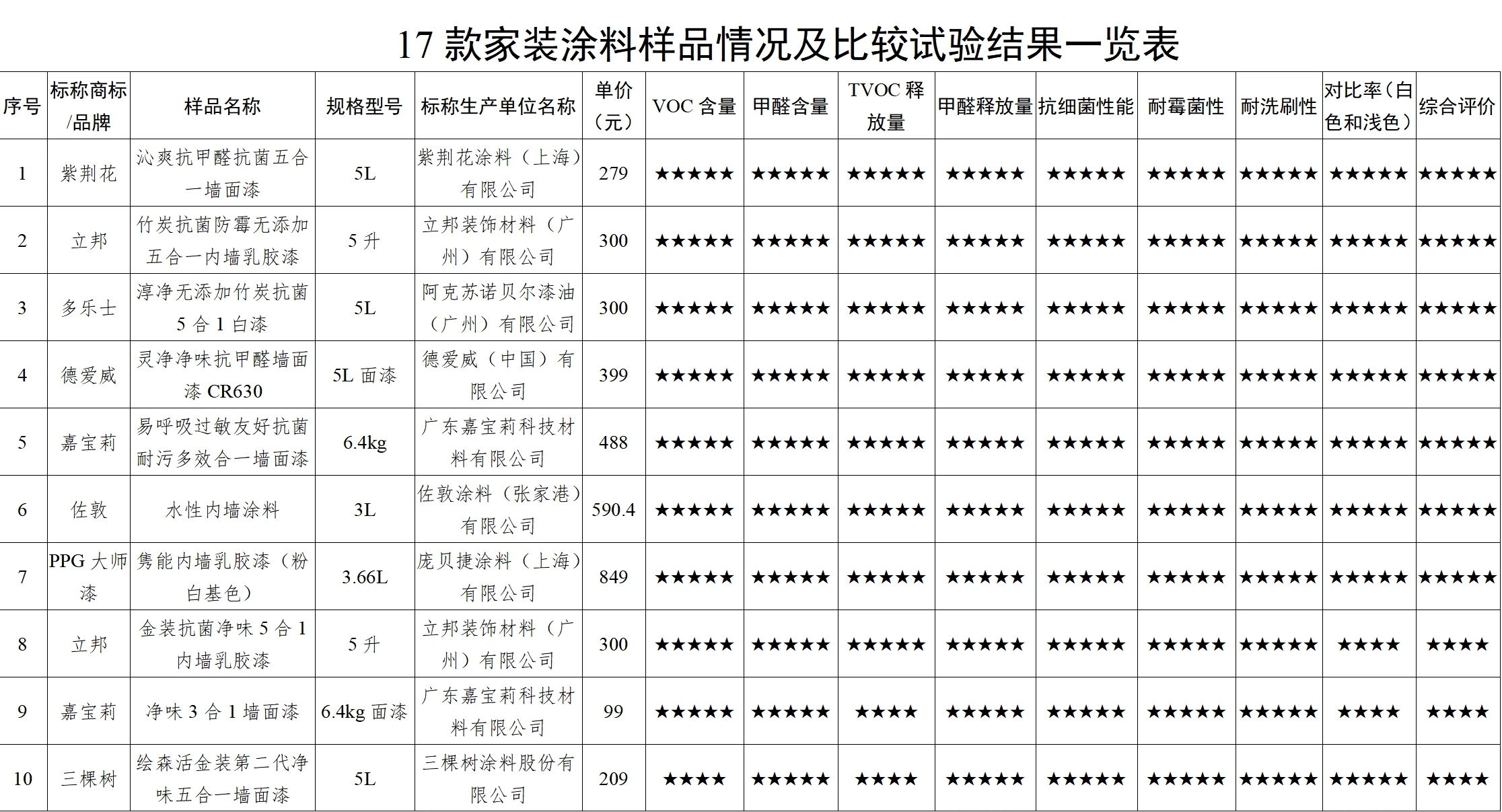 市面上的內(nèi)墻涂料安全嗎?甲醛含量如何?在潮濕高溫的天氣容易發(fā)霉嗎?如何選購(gòu)優(yōu)質(zhì)的涂料產(chǎn)品?為深入了解家裝涂料產(chǎn)品質(zhì)量狀況,更好指導(dǎo)消費(fèi)者科學(xué)消費(fèi),近日,廣東省消委會(huì)聯(lián)合惠州市消委會(huì)對(duì)17款內(nèi)墻涂料開展比較試驗(yàn)并發(fā)布《家裝涂料比較試驗(yàn)報(bào)告》,報(bào)告根據(jù)比較試驗(yàn)結(jié)果,對(duì)17款樣品進(jìn)行了綜合評(píng)價(jià),其中綜合評(píng)價(jià)五星的樣品有7款,四星的有7款,三星的有3款。