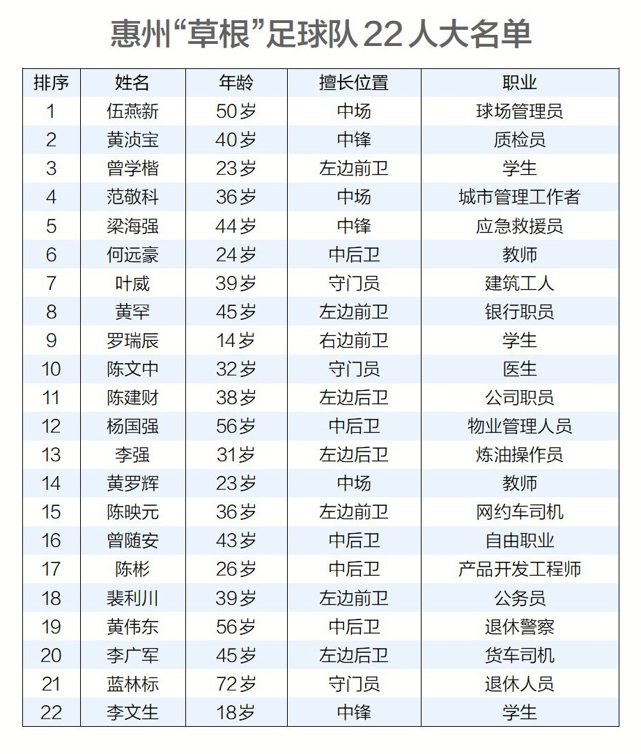 將代表惠州迎戰(zhàn)香港明星足球隊的惠州“草根”足球隊22人名單,已于11月15日正式公布。這22人來自全市的各行各業(yè),其中最年長的是72歲的退休人員,最小的則是只有14歲的學(xué)生。12月15日,由他們組成的惠州“草根”足球隊,將與女子足球隊一起在惠州奧林匹克體育場對陣香港明星足球隊。