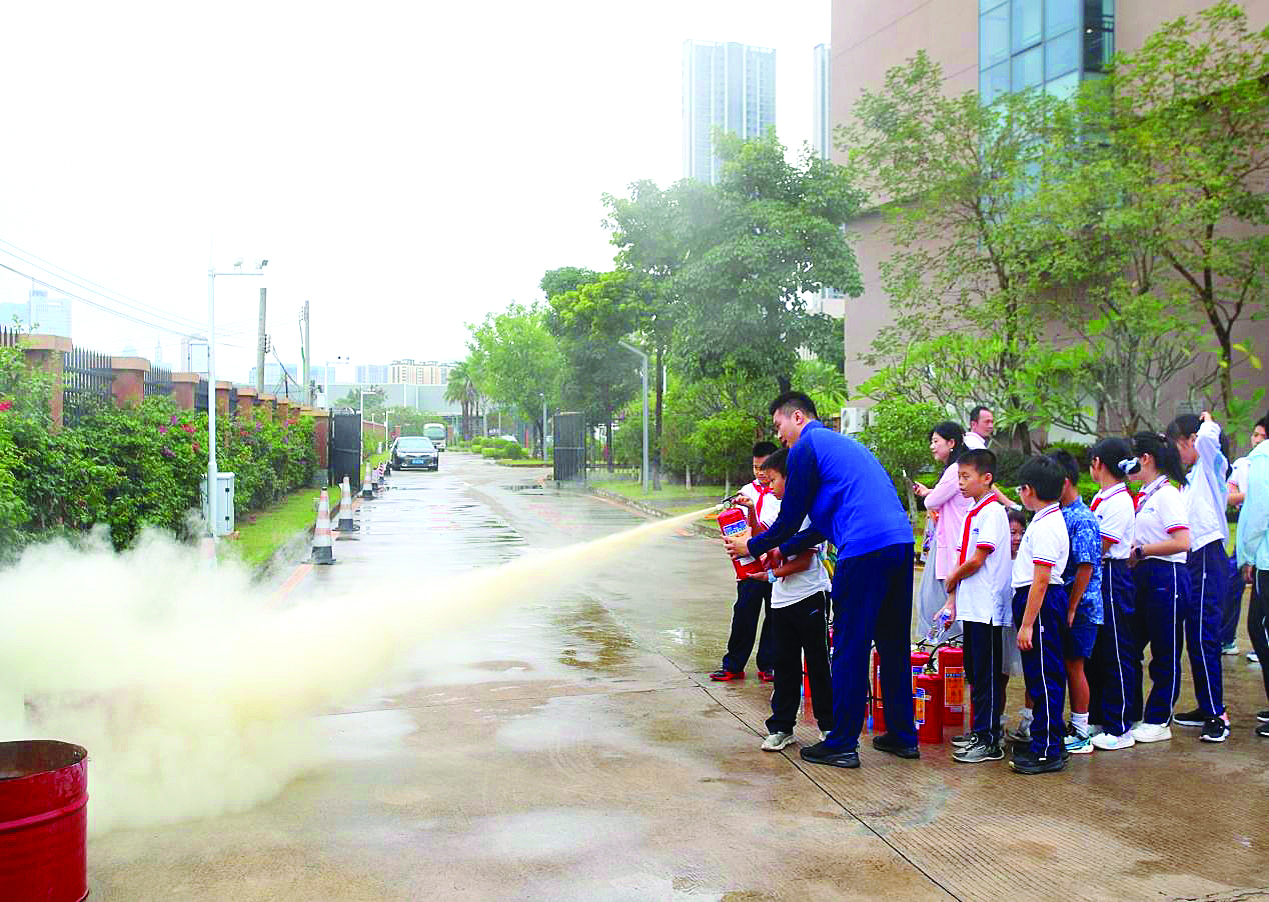 在消防員的指導下,孩子們依次體驗操作干粉滅火器滅火。惠州日報記者鐘暢新 攝