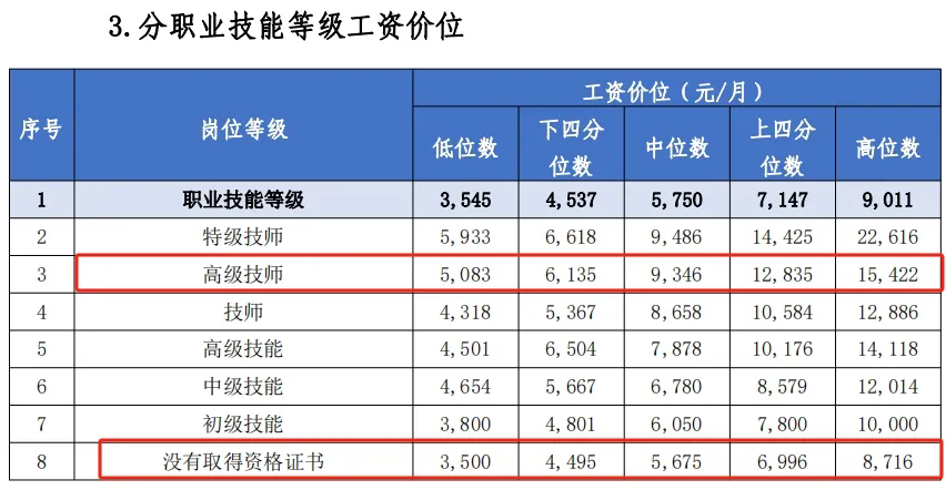 例如,高級(jí)技師(一級(jí))的工資中位數(shù)為9346元/月,而沒(méi)有取得資格證書(shū)的中位數(shù)為5675元/月,相差3671元/月。