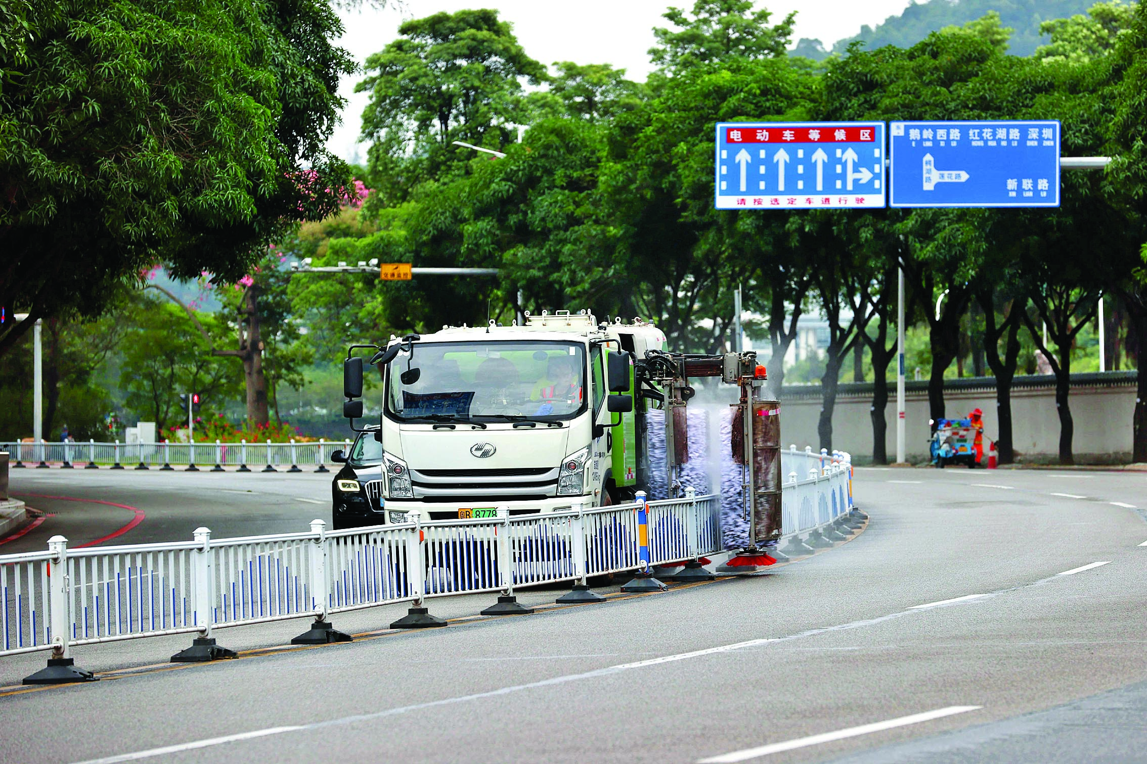 清潔車在清洗護(hù)欄。惠州日報記者楊建業(yè) 攝