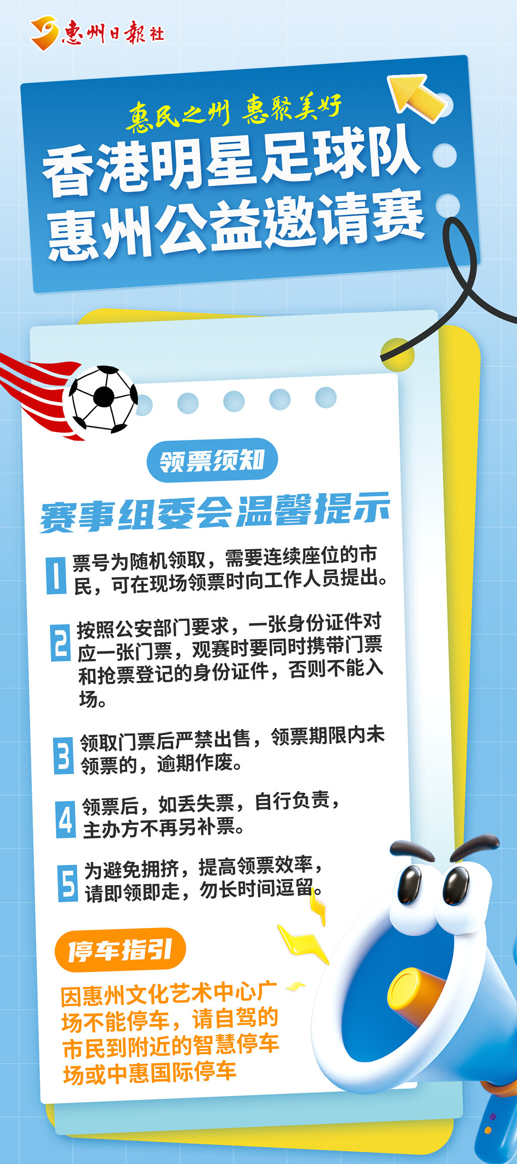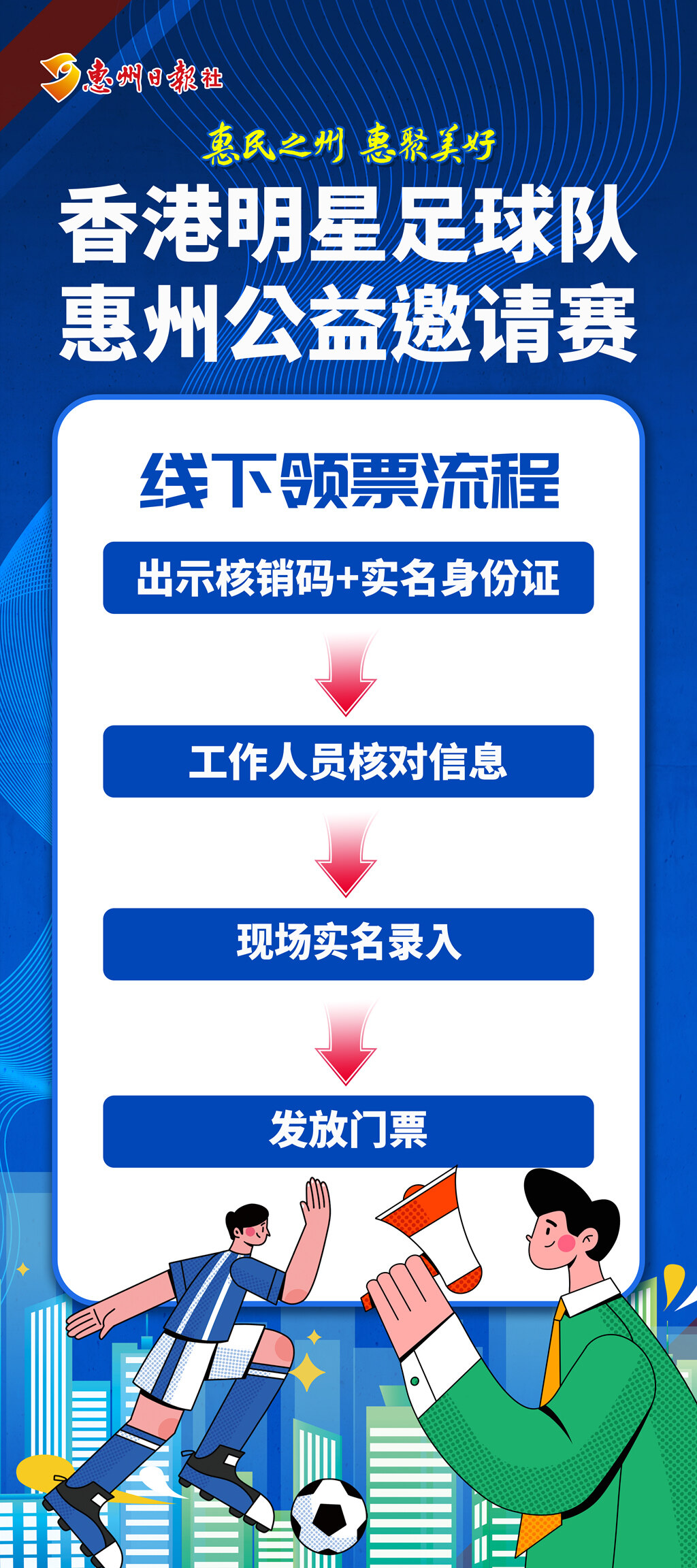 惠州日報(bào)訊 (記者龔妍)恭喜搶到門票的球迷們!11月27日晚8時(shí),“惠民之州 惠聚美好”香港明星足球隊(duì)惠州公益邀請賽第三輪免費(fèi)門票開啟搶票,至此,三輪搶票全部結(jié)束。記者從賽事組委會(huì)獲悉,主辦方為廣大市民、球迷準(zhǔn)備了兩種領(lǐng)票方式:選擇“快遞到家”的市民,在收到門票后,請?jiān)?2月5日前掃描門票上的二維碼,輸入相關(guān)身份信息;選擇“線下領(lǐng)票”的市民,可憑搶票時(shí)填寫的實(shí)名登記證件和核銷碼,于11月29日、11月30日、12月1日10:00~20:30到惠州文化藝術(shù)中心一樓大廳領(lǐng)取門票。
