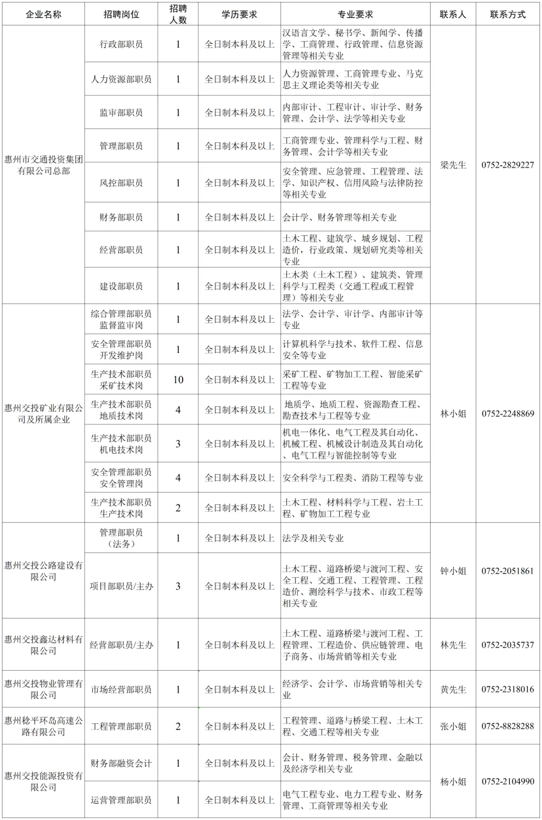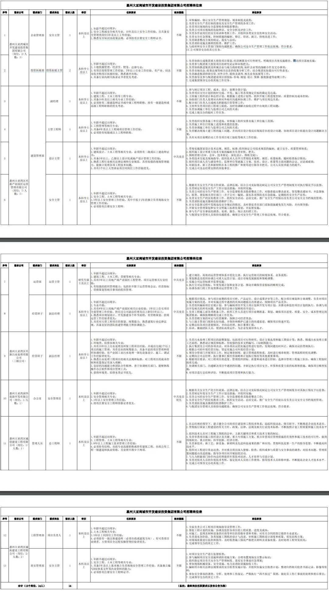本次招聘工作人員不超過14名,具體招聘崗位、招聘人數(shù)、崗位職責及任職條件詳見《惠州大亞灣城市開發(fā)建設(shè)投資集團有限公司招聘崗位表》。