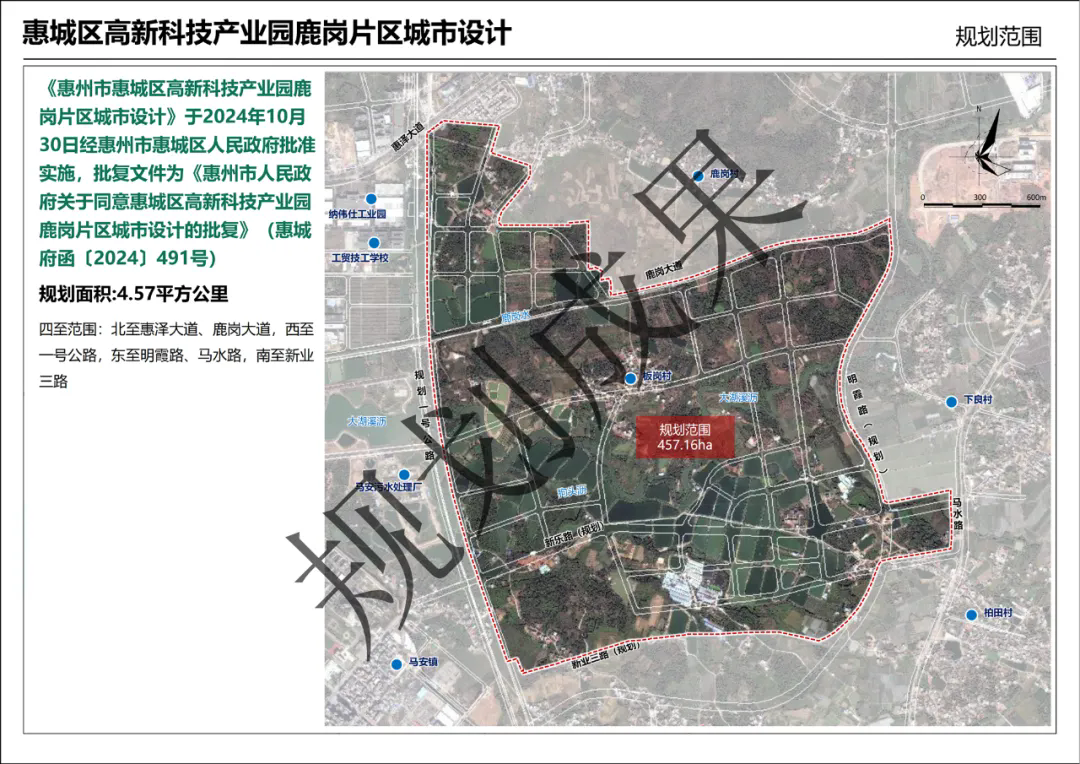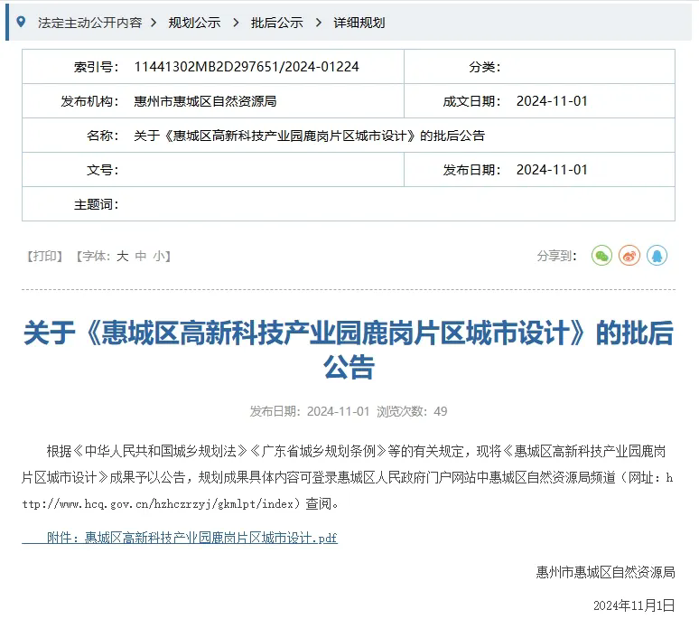 根據(jù)公告顯示,《惠州市惠城區(qū)高新科技產(chǎn)業(yè)園鹿崗片區(qū)城市設(shè)計》于2024年10月30日經(jīng)惠州市惠城區(qū)人民政府批準實施,批復文件為《惠州市人民政府關(guān)于同意惠城區(qū)高新科技產(chǎn)業(yè)園鹿崗片區(qū)城市設(shè)計的批復》(惠城府函〔2024〕491號) 。