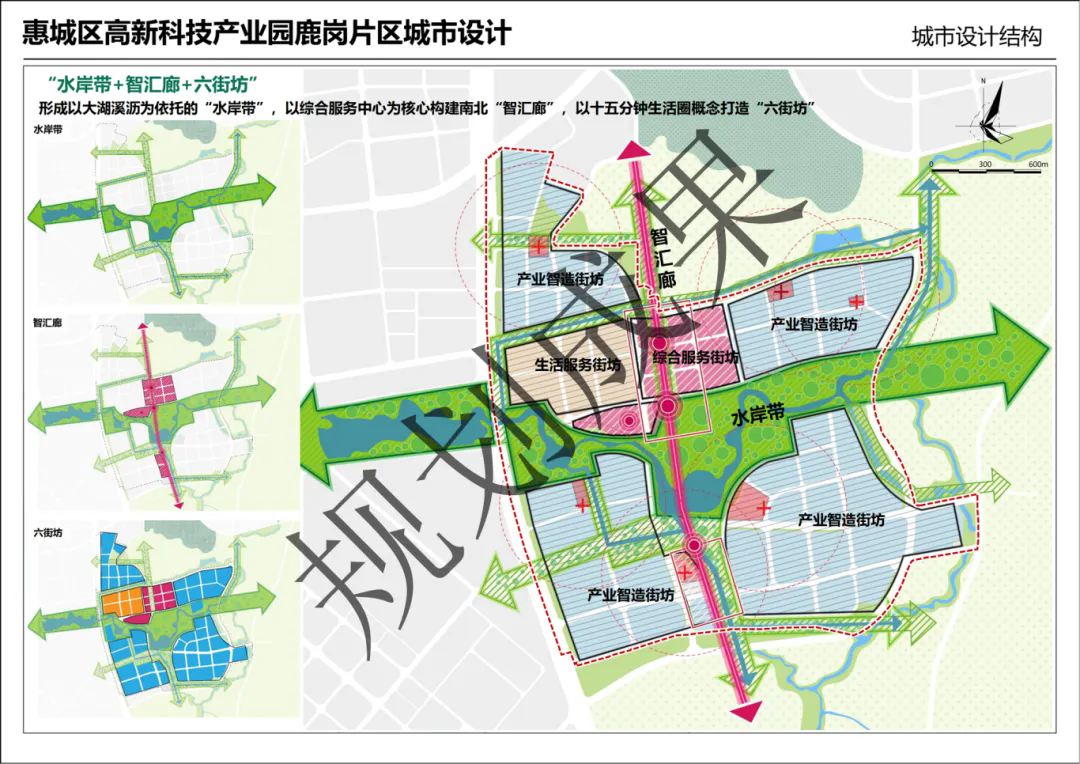 鹿崗片區(qū)的城市設(shè)計結(jié)構(gòu)為“水岸帶+智匯廊+六街坊”。