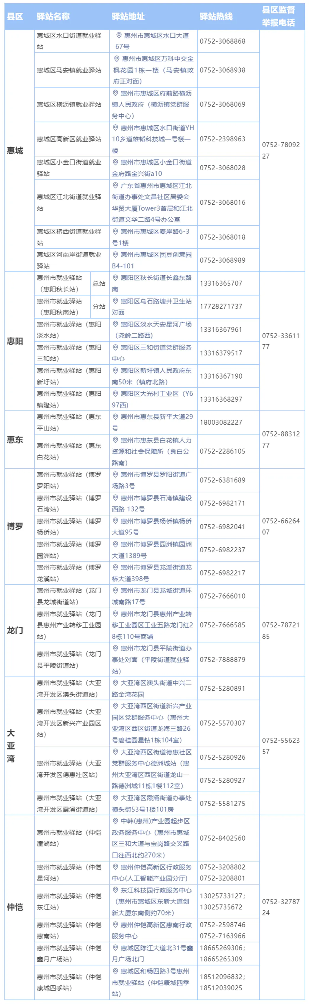 惠州市就業(yè)驛站已建成站點(diǎn)一覽表