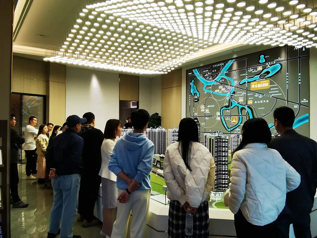 11月23日上午,在市區(qū)江北金石三路的智創(chuàng)星圖項(xiàng)目,記者在售樓處看到,有10多批客戶正在沙盤區(qū)和洽談區(qū)看房。一位工作人員還不停用對講機(jī)連線樣板房區(qū),通知對方準(zhǔn)備接待客戶看房。