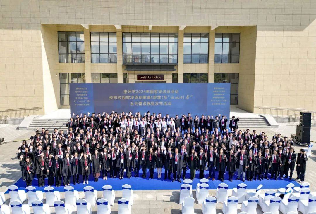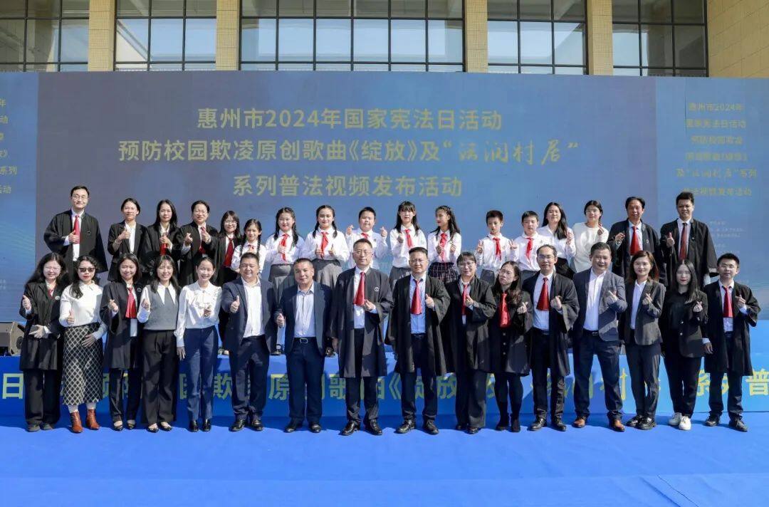 在第十一個國家憲法日,惠州市律師協(xié)會預(yù)防校園欺凌原創(chuàng)歌曲、“法潤村居”系列普法視頻發(fā)布活動在惠州市青少年法治教育基地隆重舉行。此次活動由市普法辦公室、市司法局、市教育局以及市律師協(xié)會共同主辦。市律師行業(yè)黨委專職副書記謝峰、普法與依法治理科科長余雨植,惠城區(qū)司法局,惠州市、惠城區(qū)教育局,市律師協(xié)會等單位相關(guān)負(fù)責(zé)人,以及160余名惠州執(zhí)業(yè)律師、第十一小學(xué)金榜分校部分師生參加活動。