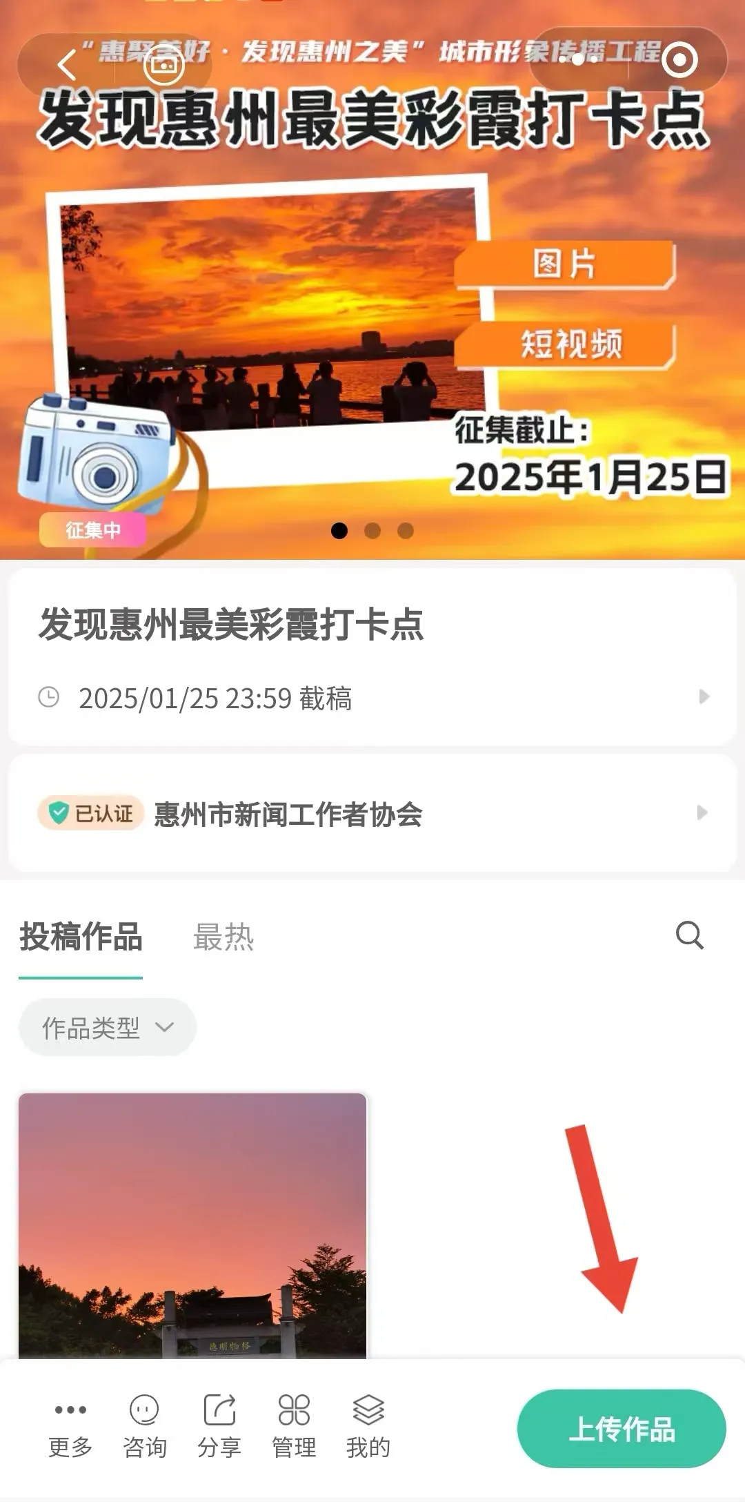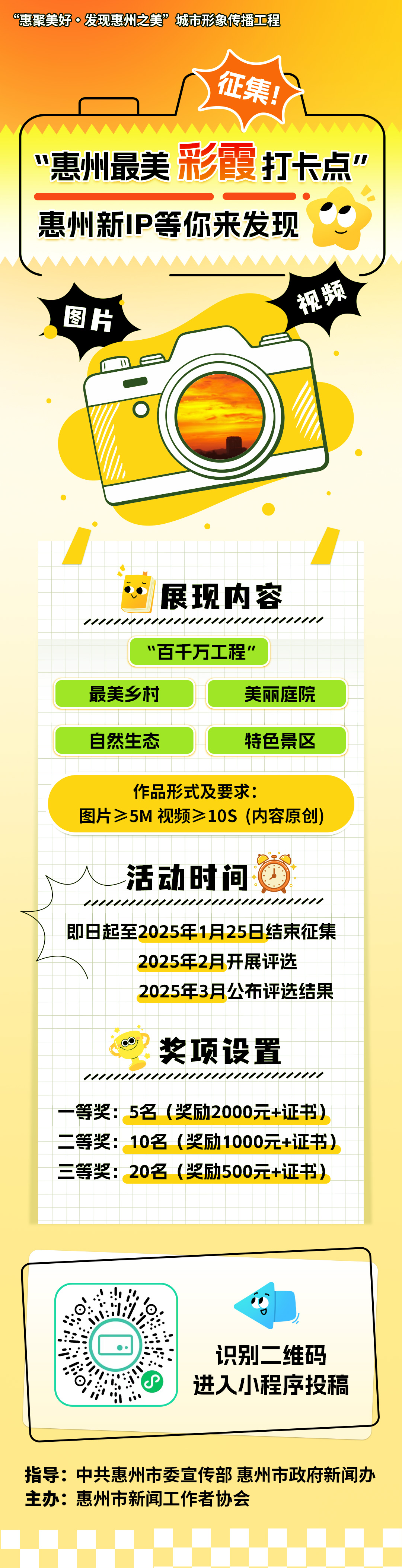 為深入實施“惠聚美好·發(fā)現(xiàn)惠州之美”城市形象傳播工程,讓惠州的“美”看得見摸得著、惠州的“好”叫得響傳得開,由中共惠州市委宣傳部、惠州市政府新聞辦指導,惠州市新聞工作者協(xié)會組織開展的“發(fā)現(xiàn)惠州最美彩霞打卡點”線上征集活動開始啦!