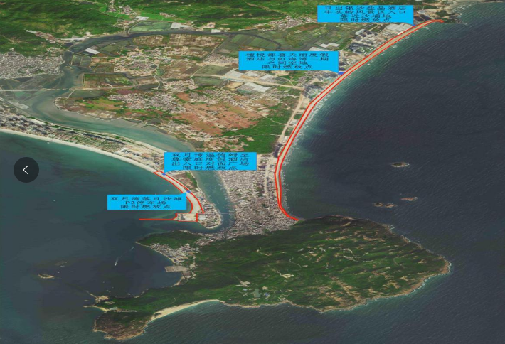 (二)港口濱海旅游度假區(qū)劃定東山海和沙咀尾靠近沙灘沙浦地附近劃定4個空曠沙灘區(qū)域(日出銀沙鹽晶酒店牛頭嶺風景區(qū)入口靠近沙浦地區(qū)域;檀悅都喜天麗度假酒店與虹海灣二期之間空地;雙月灣溫德姆至尊豪庭度假酒店出入口對面廣場;雙月灣落日沙灘P2停車場對出沙浦地區(qū)域)定為限時可燃放區(qū),將18時至22時規(guī)定為可燃放時間(紅色區(qū)域為禁燃范圍)。