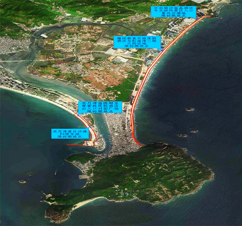 (二)港口濱海旅游度假區(qū)劃定東山海和沙咀尾靠近沙灘沙浦地附近劃定4個空曠沙灘區(qū)域(日出銀沙鹽晶酒店牛頭嶺風(fēng)景區(qū)入口靠近沙浦地區(qū)域;檀悅都喜天麗度假酒店與虹海灣二期之間空地;雙月灣溫德姆至尊豪庭度假酒店出入口對面廣場;雙月灣落日沙灘P2停車場對出沙浦地區(qū)域)定為限時可燃放區(qū),將18時至22時規(guī)定為可燃放時間(紅色區(qū)域為禁燃范圍)。