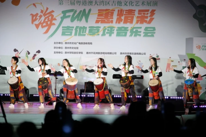 一段節(jié)奏鮮明而氣勢(shì)如虹的非洲串燒表演,點(diǎn)燃了觀眾的情緒,為音樂會(huì)開場(chǎng)營(yíng)造了熱鬧的氛圍。開場(chǎng)例牌菜則是由惠陽區(qū)流行音樂協(xié)會(huì)演奏的粵港澳大灣區(qū)吉他文化藝術(shù)展演主題曲《我的吉他》,熟悉的旋律吸引不少觀眾跟唱。隨后,古他獨(dú)奏、吉他彈唱、手碟演奏、樂隊(duì)演唱等節(jié)目接連上演。