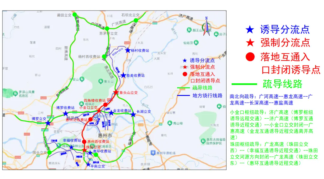 廣惠高速小金口樞紐互通往深圳、河源方向車(chē)輛可通過(guò)惠州大道繞行廣惠高速金龍互通通行;