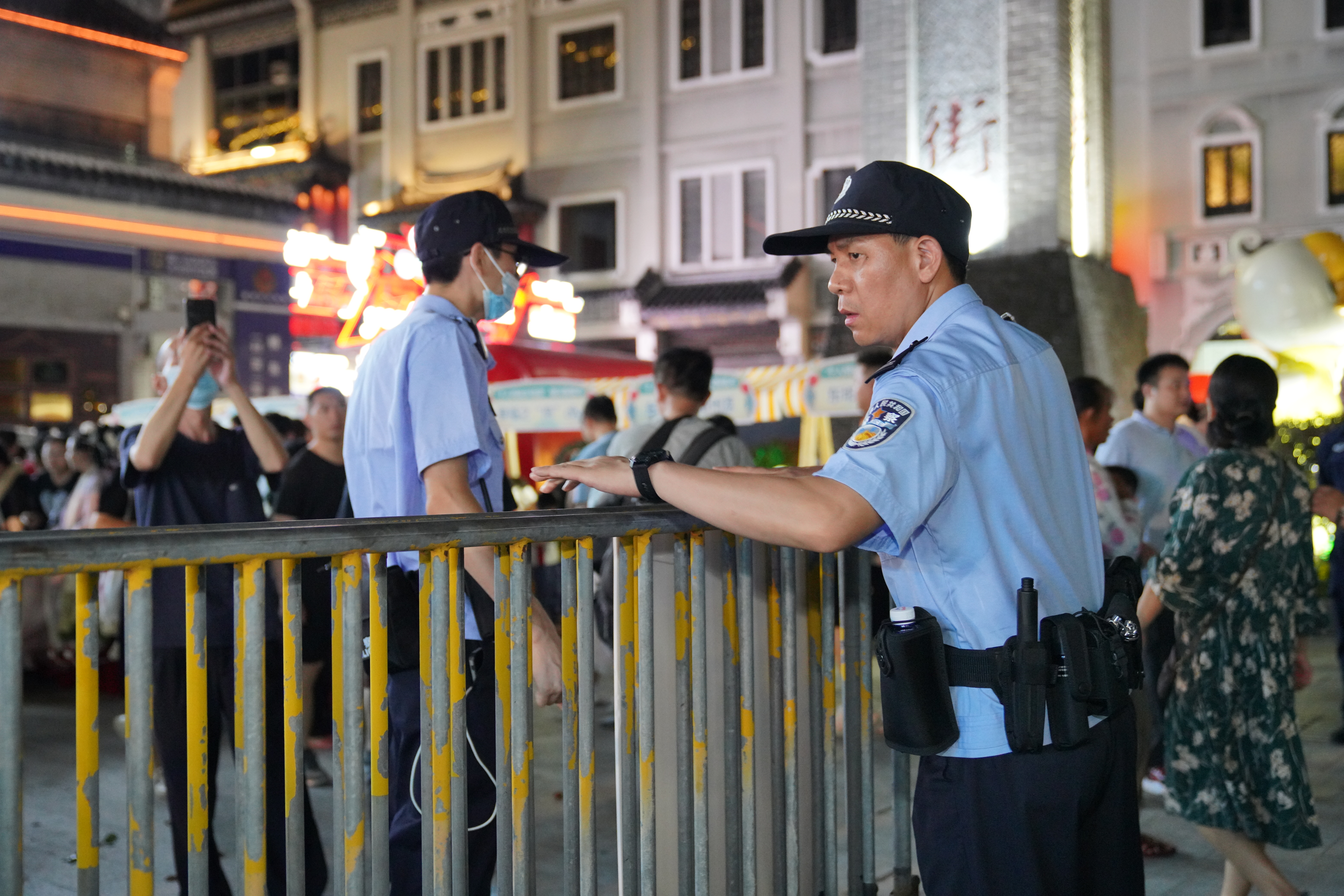 面對突發(fā)情況,曾文浩、王裕龍立即安排警力手牽手形成一堵“人墻”,對兩股參觀人流按照不同方向進行有效分流,并及時將泗洲塔下一打卡景點燈光關閉,以防止游客集中打卡,影響分流效果。“我們對各種突發(fā)情況都設有預案,當時處置措施還算妥當。”曾文浩說。