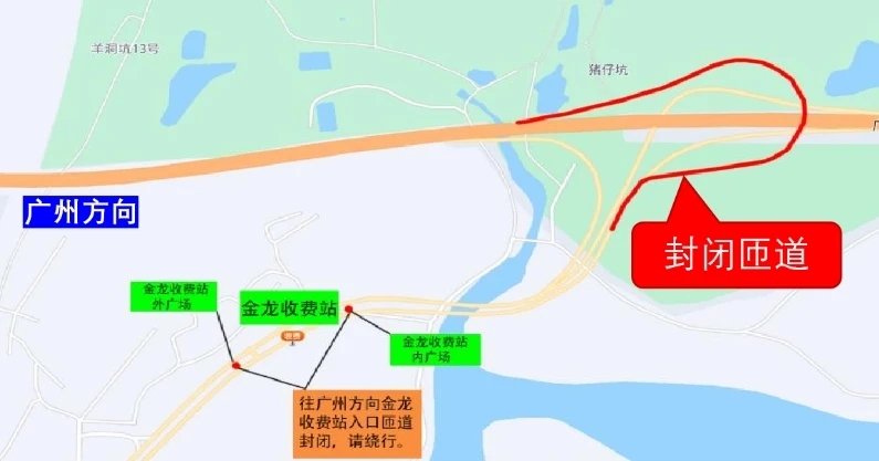 金龍收費(fèi)站往廣州方向入口匝道封閉示意圖。