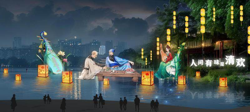 燈組“千年之約”場景設(shè)計來源于蘇東坡寓惠兩年多對惠州巨大的貢獻(xiàn),充分利用東坡、朝云、亭山樓閣等元素,營造出“天上宮闕”般的場景,如夢如幻仿佛穿越時空回到一千年前,與東坡有個跨越時空的約定。